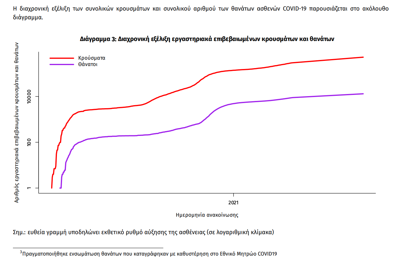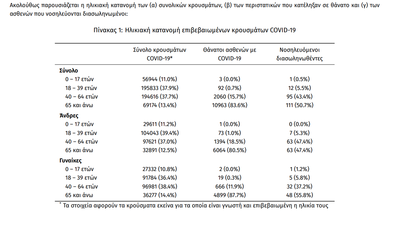 Ο αριθμός των ασθενών που νοσηλεύονται διασωληνωμένοι είναι 219 (60.7% άνδρες). Η διάμεση ηλικία τους είναι 65 έτη. To 84.5% έχει υποκείμενο νόσημα ή/και ηλικία 70 ετών και άνω. Από την αρχή της πανδημίας έχουν εξέλθει από τις ΜΕΘ 2.848 ασθενείς. Οι εισαγωγές4 νέων ασθενών Covid-19 στα νοσοκομεία της επικράτειας είναι 211 (ημερήσια μεταβολή -0.47%). Ο μέσος όρος εισαγωγών του επταημέρου είναι 206 ασθενείς.Η διάμεση ηλικία των κρουσμάτων είναι 40 έτη (εύρος 0.2 έως 106 έτη), ενώ η διάμεση ηλικία των θανόντων είναι 78 έτη (εύρος 0.2 έως 106 έτη).