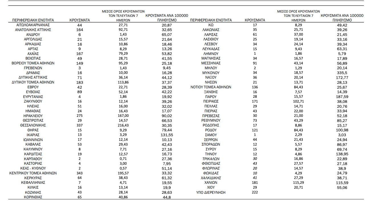 Κατανομή ανακοινωθέντων εγχώριων κρουσμάτων: Από το σύνολο των 4.181 κρουσμάτων του νέου ιού στη χώρα 15 είναι εισαγόμενα εκ των οποίων 11 εντοπίστηκαν κατόπιν ελέγχων στις πύλες εισόδου της χώρας. Η κατανομή των 4.166 νέων εγχώριων κρουσμάτων ανά Περιφερειακή Ενότητα παρουσιάζεται στον κατωτέρω πίνακα.5 Πίνακας 2: Ημερήσιος αριθμός και κρούσματα ανά 100.000 πληθυσμού επιβεβαιωμένων εγχώριων κρουσμάτων COVID-19 ανά περιφερειακή ενότητα στις 10 Αυγούστου 2021