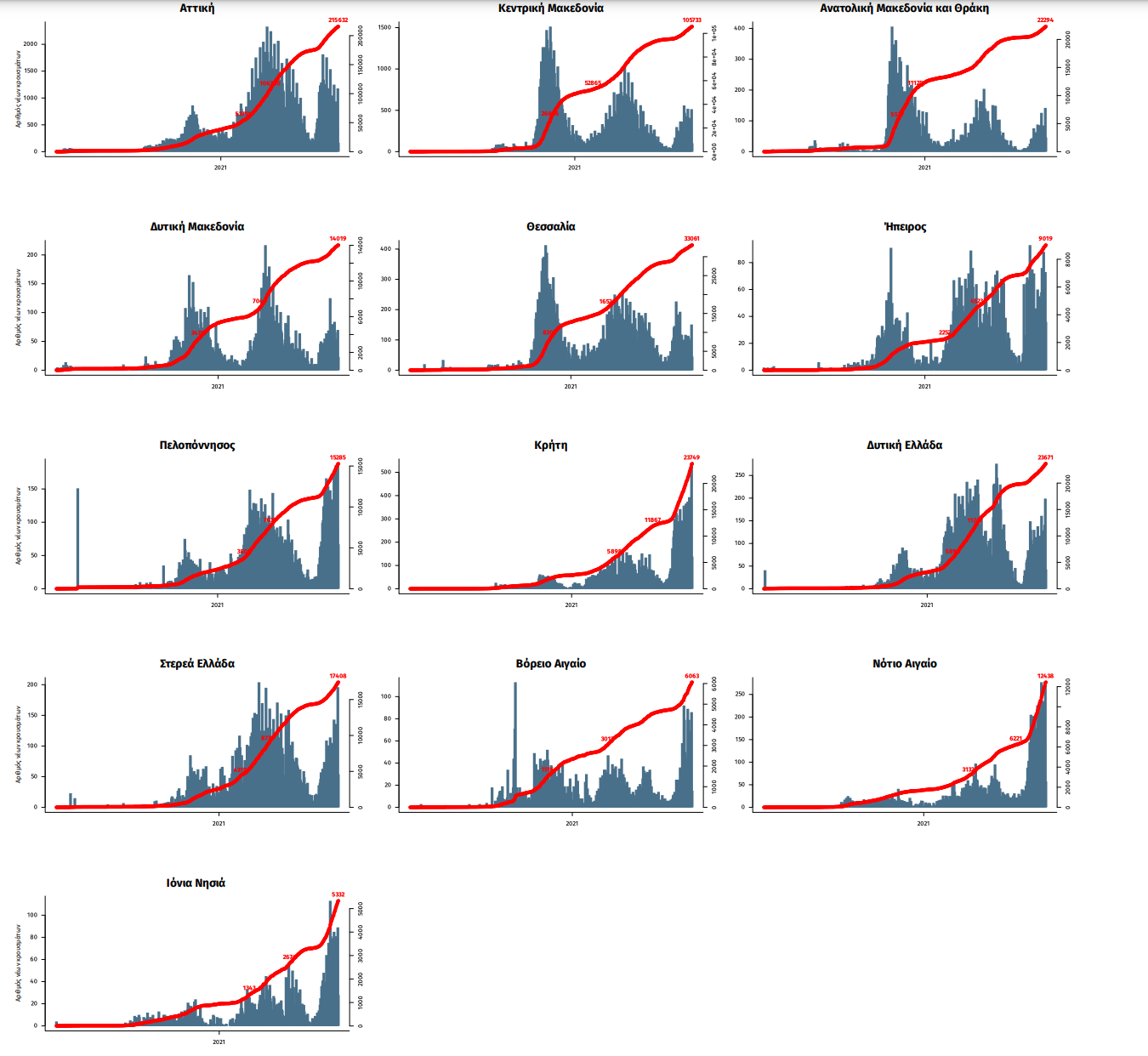 Παράρτημα 1: Επιδημικές καμπύλες κρουσμάτων COVID-19 με βάση την δηλωθείσα διεύθυνση μόνιμης κατοικίας του κρούσματος ή τη διεύθυνση προσωρινής διαμονής για τους τουρίστες και άλλους προσωρινά διαμένοντες στην Ελλάδα. Συμπεριλαμβάνονται τόσο κρούσματα με ιστορικό ταξιδίου όσο και κρούσματα με πιθανή εγχώρια μετάδοση.