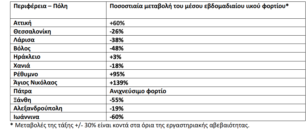 Ανακοινώνονται τα αποτελέσματα των εργαστηριακών ελέγχων του Εθνικού Δικτύου Επιδημιολογίας Λυμάτων για την επιδημιολογική επιτήρηση του ιού SARS-CoV-2 σε αστικά λύματα, το οποίο λειτουργεί υπό το συντονισμό του ΕΟΔΥ. Τα δείγματα προέρχονται από την Περιφέρεια Αττικής και τις πόλεις της Θεσσαλονίκης, της Λάρισας, του Βόλου, του Ηρακλείου, των Χανίων, του Ρεθύμνου, του Αγίου Νικολάου Λασιθίου, της Πάτρας, της Ξάνθης, της Αλεξανδρούπολης και των Ιωαννίνων. Τα δείγματα λαμβάνονται από τις εισόδους των κατά τόπους Μονάδων Επεξεργασίας Λυμάτων (ΜΕΛ) και αντιστοιχούν στον πληθυσμό που εξυπηρετείται από αυτές. Πίνακας 1: Ποσοστιαία μεταβολή στη μέση συγκέντρωση του ιικού φορτίου του SARS-CoV-2 στα αστικά λύματα ανά 100.000 κατοίκους την εβδομάδα 2-8 Αυγούστου 2021 σε σχέση με την εβδομάδα 26 Ιουλίου – 1 Αυγούστου 2021.