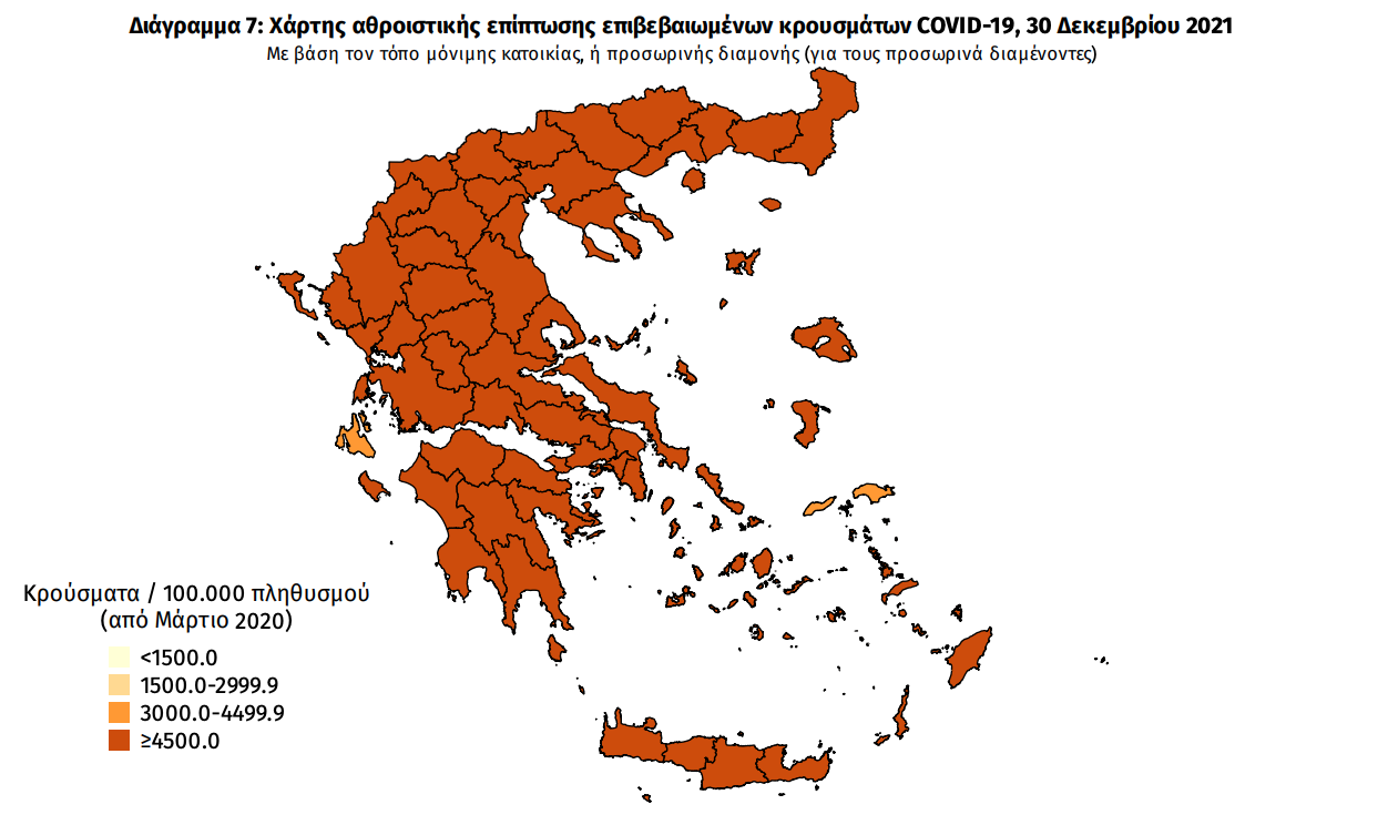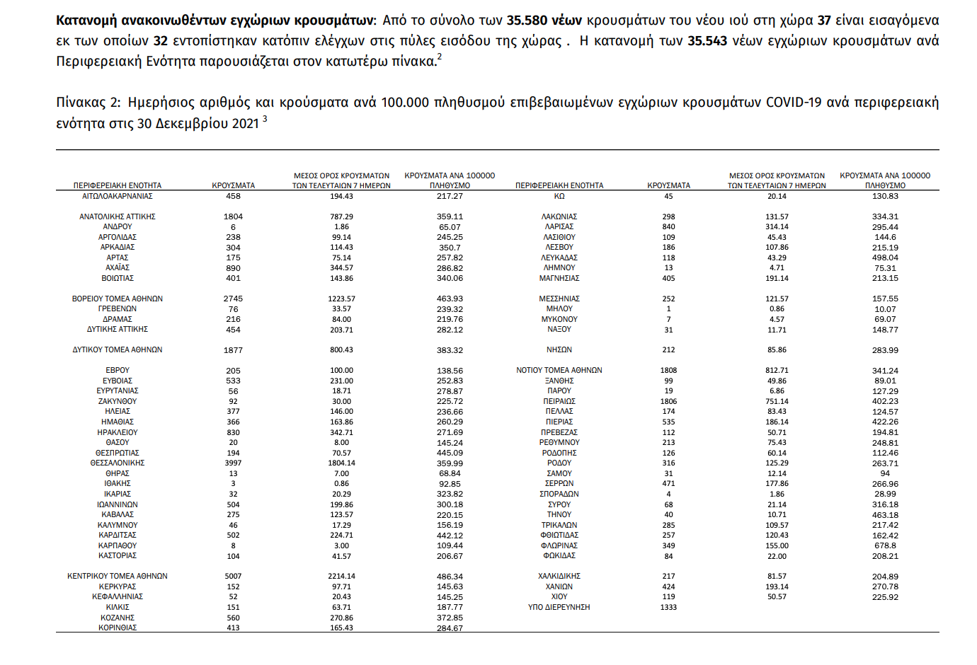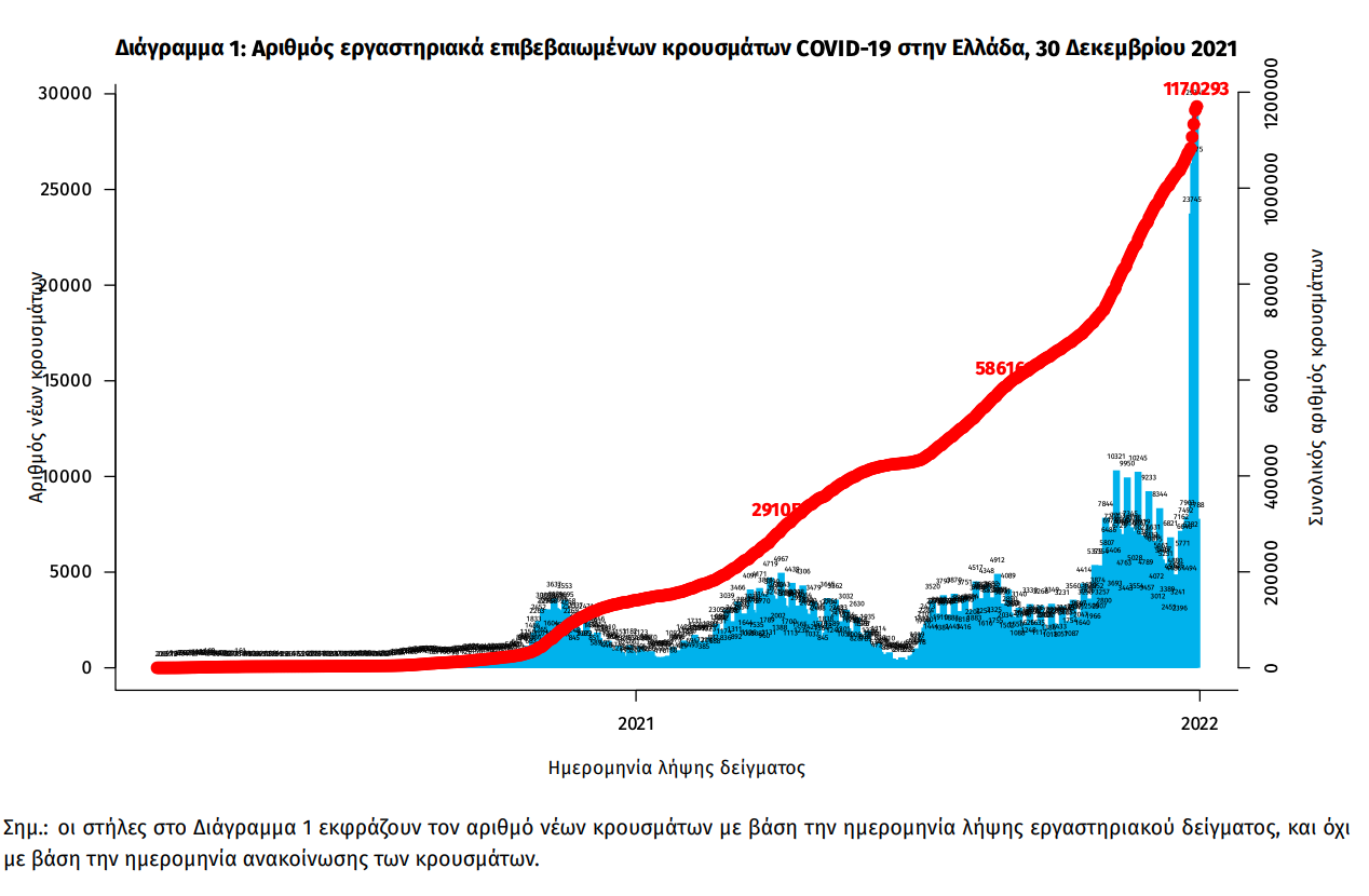 Τα στοιχεία που παρουσιάζονται αφορούν περιστατικά από την επιδημιολογική επιτήρηση της νόσου από το νέο κορωνοϊό (COVID19), με βάση τα δεδομένα που έχουν δηλωθεί στον ΕΟΔΥ και καταγραφεί μέχρι τις 30 Δεκεμβρίου 2021 (ώρα 15:00). Τα νέα εργαστηριακά επιβεβαιωμένα κρούσματα της νόσου που καταγράφηκαν τις τελευταίες 24 ώρες είναι 35.580, εκ των οποίων 32 εντοπίστηκαν κατόπιν ελέγχων στις πύλες εισόδου της χώρας. Ο συνολικός αριθμός των κρουσμάτων ανέρχεται σε 1.170.293 (ημερήσια μεταβολή +3.1%), εκ των οποίων 50.4% άνδρες. Με βάση τα επιβεβαιωμένα κρούσματα των τελευταίων 7 ημερών, 217 θεωρούνται σχετιζόμενα με ταξίδι από το εξωτερικό και 1.410 είναι σχετιζόμενα με ήδη γνωστό κρούσμα. Ημερήσια εξέλιξη της πανδημίας: Η ημερήσια κατανομή των επιβεβαιωμένων κρουσμάτων είναι η ακόλουθη (η γραμμή παριστάνει την συνολική, αθροιστική κατανομή των κρουσμάτων).