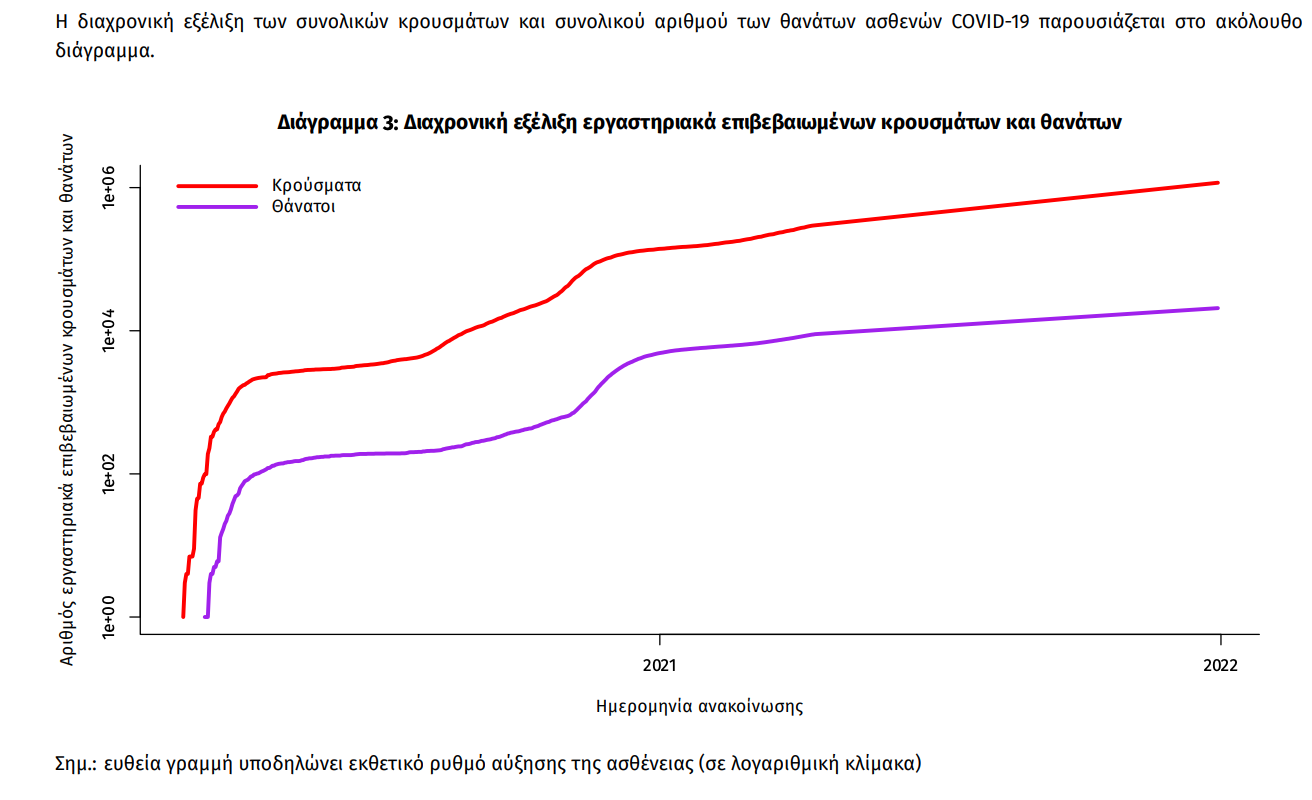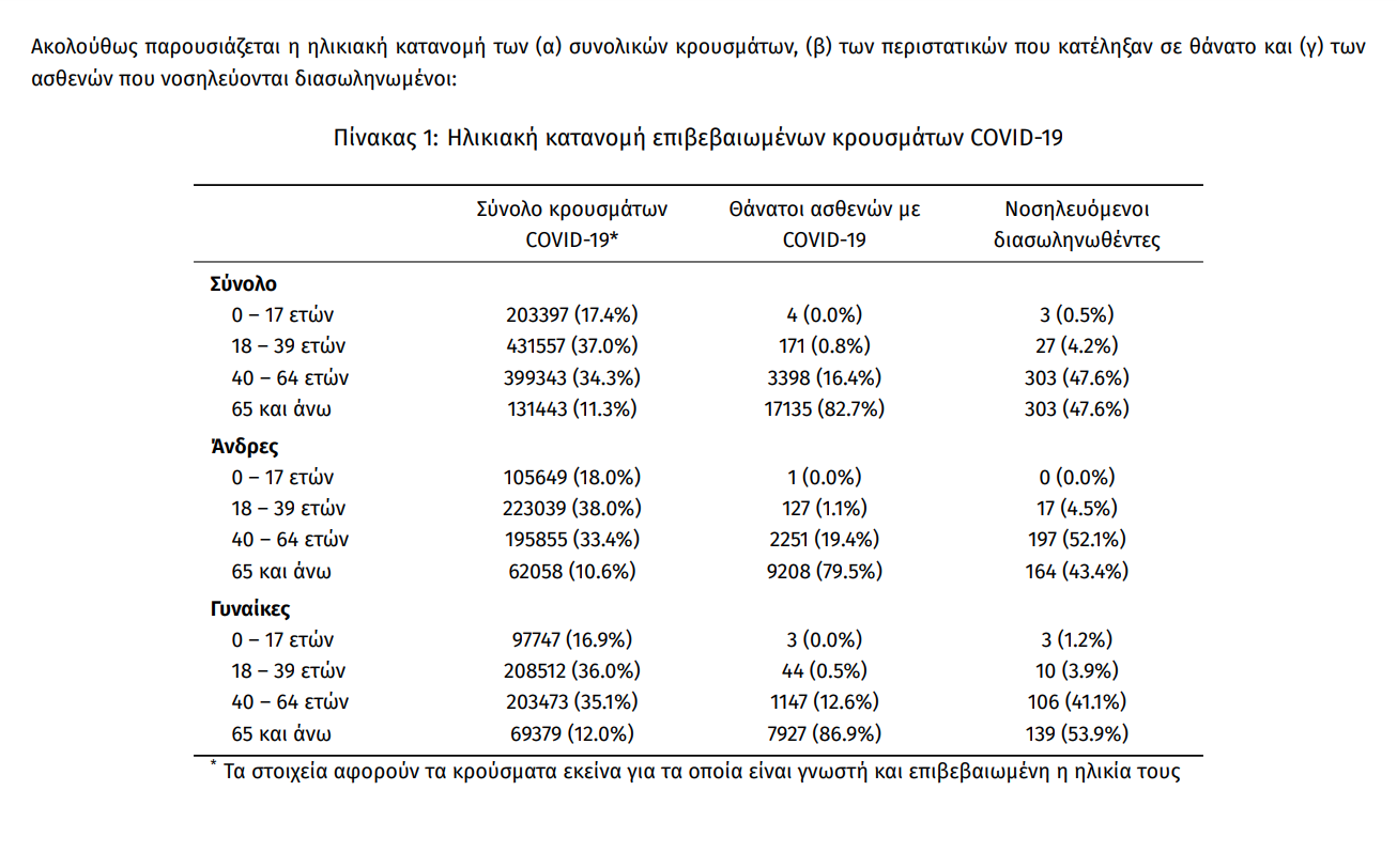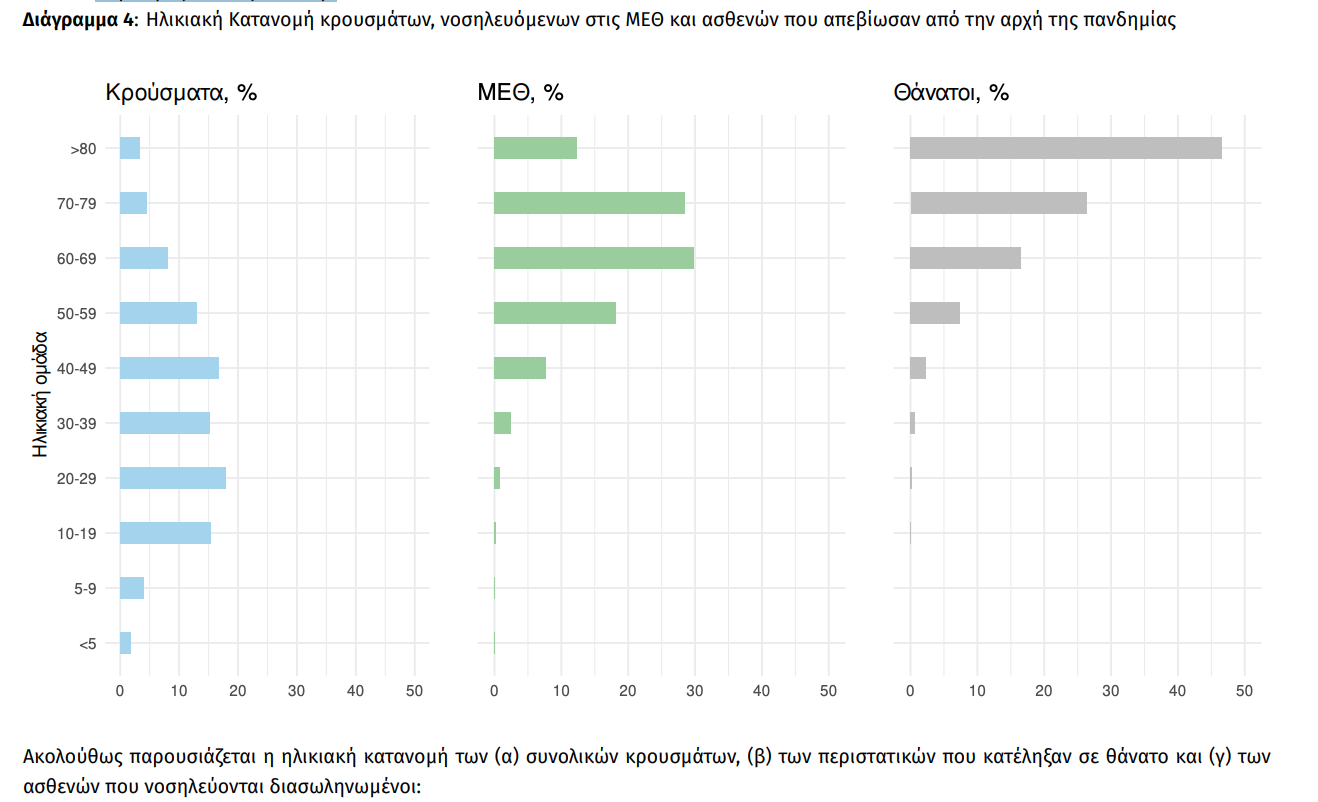 Ο αριθμός των ασθενών που νοσηλεύονται διασωληνωμένοι είναι 636 (59.7% άνδρες). Η διάμεση ηλικία τους είναι 64 έτη. To 80.5% έχει υποκείμενο νόσημα ή/και ηλικία 70 ετών και άνω. Μεταξύ των ασθενών που νοσηλεύονται διασωληνωμένοι, 540 (84.91%) είναι ανεμβολίαστοι ή μερικώς εμβολιασμένοι και 96 (15.09%) είναι πλήρως εμβολιασμένοι. Από την αρχή της πανδημίας έχουν εξέλθει από τις ΜΕΘ 3.751 ασθενείς. Οι εισαγωγές1 νέων ασθενών Covid-19 στα νοσοκομεία της επικράτειας είναι 421 (ημερήσια μεταβολή +1.94%). Ο μέσος όρος εισαγωγών του επταημέρου είναι 346 ασθενείς.Η διάμεση ηλικία των κρουσμάτων είναι 37 έτη (εύρος 0.2 έως 110 έτη), ενώ η διάμεση ηλικία των θανόντων είναι 78 έτη (εύρος 0.2 έως 106 έτη).