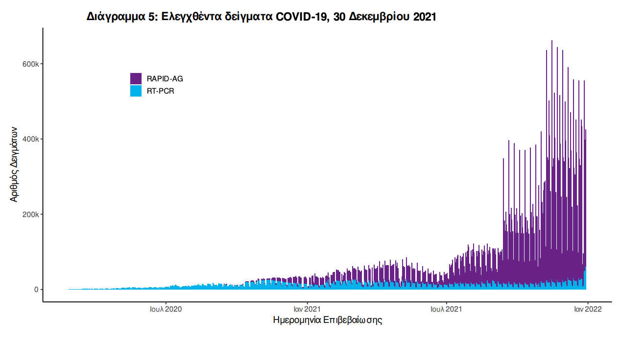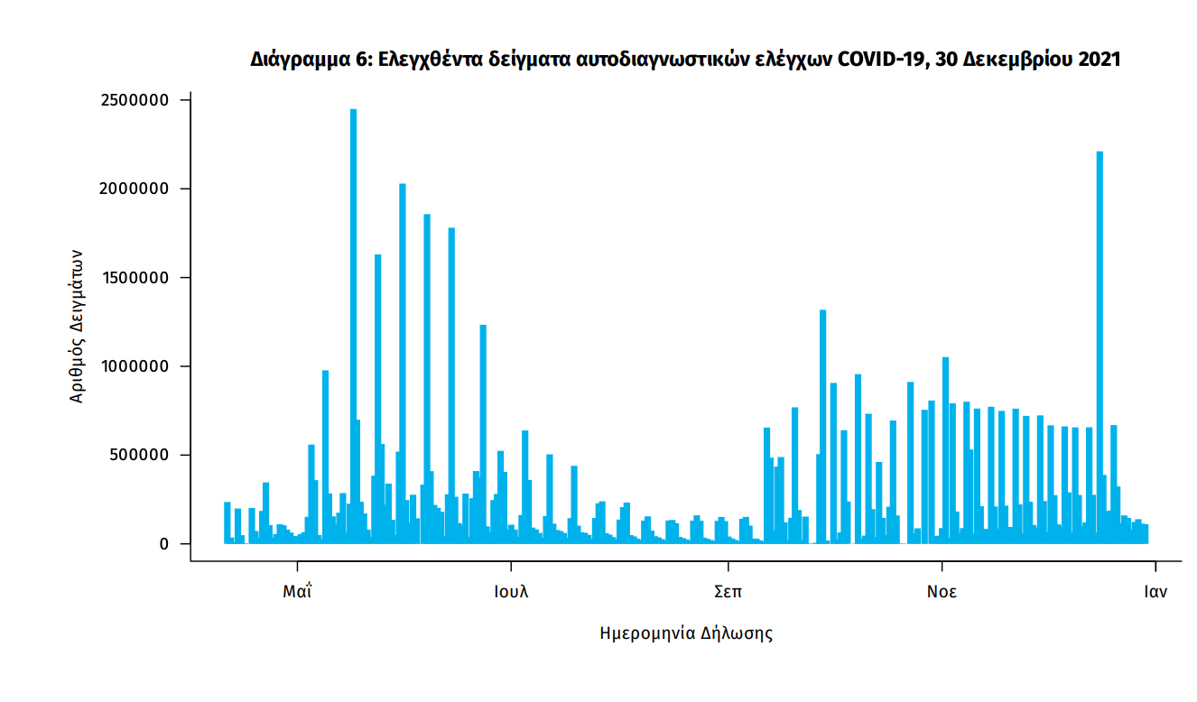 Δείγματα που έχουν ελεγχθεί: Από την 1η Ιανουαρίου 2020 μέχρι σήμερα, στα εργαστήρια που διενεργούν ελέγχους για τον νέο κορωνοϊό (SARS-CoV-2) και που δηλώνουν συστηματικά το σύνολο των δειγμάτων που ελέγχουν, έχουν συνολικά ελεγχθεί 8.201.012 κλινικά δείγματα ενώ από Μονάδες Υγείας και Κλιμάκια του ΕΟΔΥ που διενεργούν ελέγχους Rapid Ag έχουν ελεγχθεί 38.503.467 δείγματα. O μέσος όρος του επταημέρου είναι 346.931 δειγματοληπτικοί έλεγχοι. Αυτοδιαγνωστικοί έλεγχοι (Self-tests): Έως 29 Δεκεμβρίου 2021, έχουν καταγραφεί ηλεκτρονικά 66.833.993 δηλώσεις αποτελέσματος αυτοδιαγνωστικού ελέγχου, ενώ 3.840.060 άτομα προσήλθαν για επανέλεγχο. Mαζικές Δειγματοληψίες ΕΟΔΥ: Στις 29 Δεκεμβρίου 2021, πραγματοποιήθηκαν 140 δράσεις δειγματοληπτικών ελέγχων από τις Κινητές Ομάδες Υγείας (ΚΟΜΥ) του ΕΟΔΥ, στις οποίες διενεργήθηκαν 39.035 έλεγχοι Rapid Ag και ανευρέθηκαν 3.084 θετικά (7,9%).