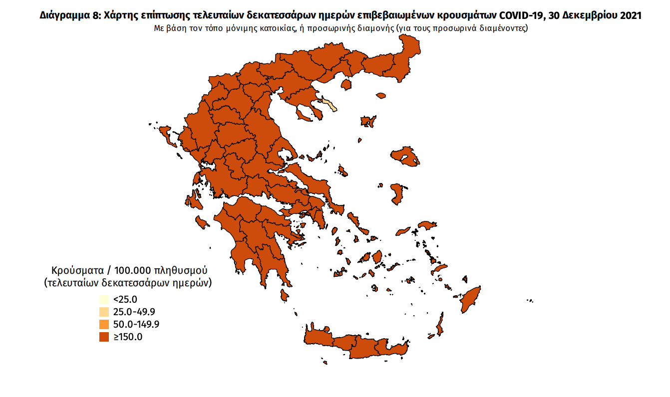 Γεωγραφική διασπορά: Ο χάρτης αποτυπώνει τη γεωγραφική κατανομή των συνολικών κρουσμάτων COVID-19 (από την αρχή της επιδημίας) ανά Περιφερειακή Ενότητα της χώρας, με βάση την δηλωθείσα διεύθυνση μόνιμης κατοικίας του ασθενούς, ή τη διεύθυνση προσωρινής διαμονής για τους τουρίστες και άλλους προσωρινά διαμένοντες στην Ελλάδα. Συμπεριλαμβάνονται τόσο κρούσματα με ιστορικό ταξιδίου (“εισαγόμενα”) όσο και κρούσματα με πιθανή εγχώρια μετάδοση.