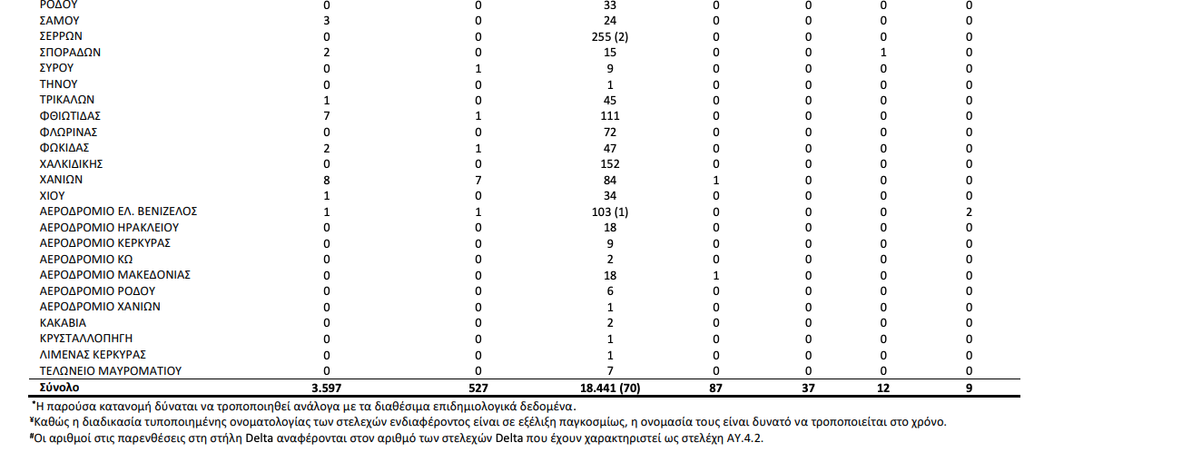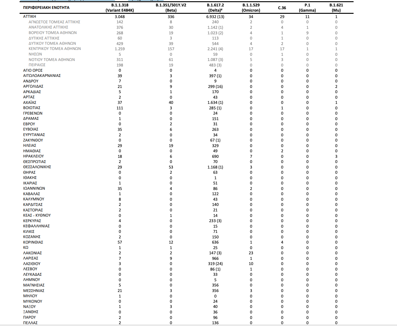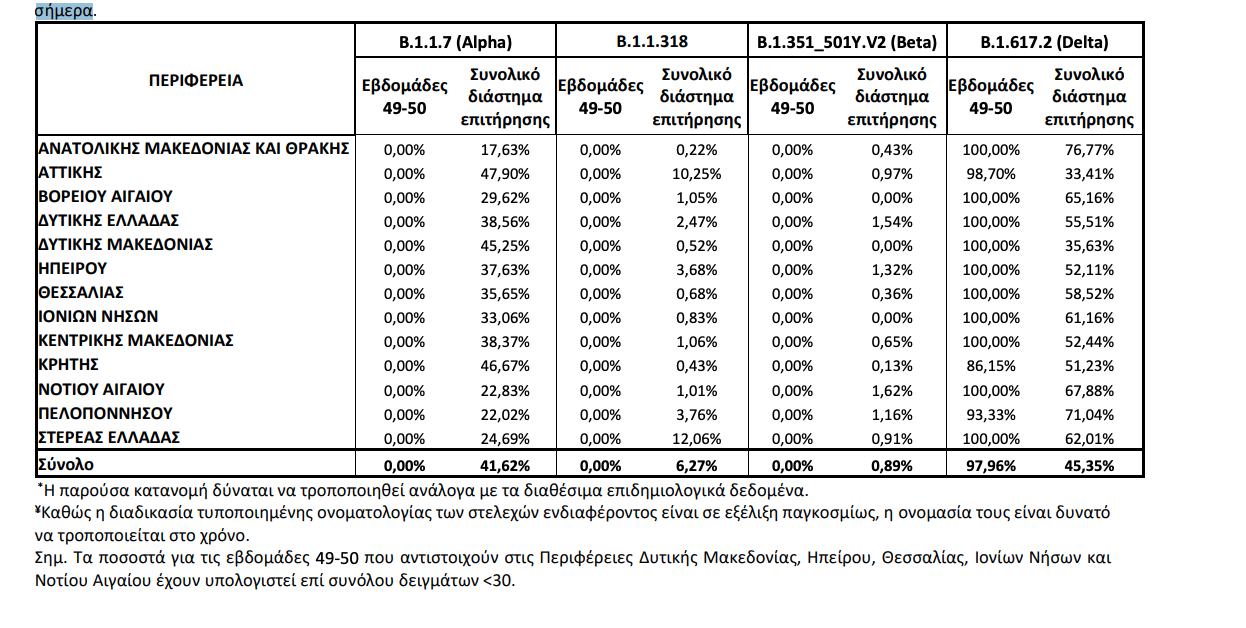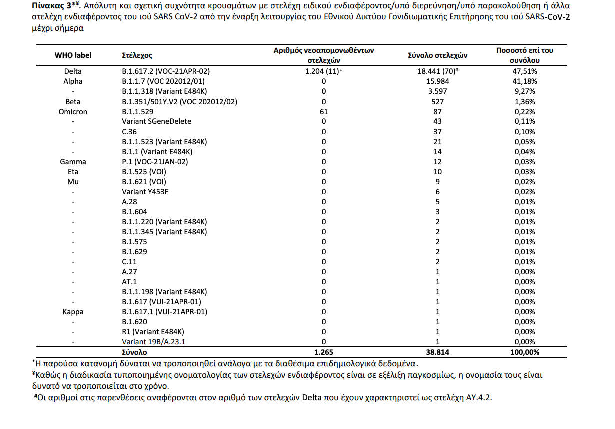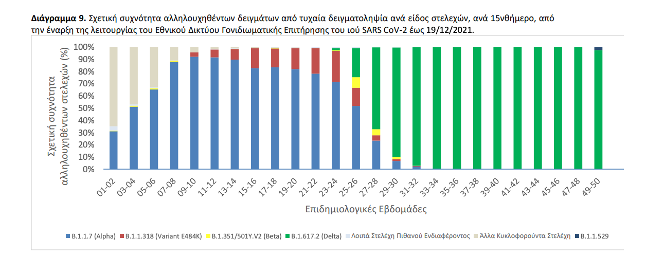 Ολοκληρώθηκε από το Eθνικό Δίκτυο Γονιδιωματικής Επιτήρησης του ιού SARS-CoV-2, που λειτουργεί υπό το συντονισμό του ΕΟΔΥ, η γονιδιωματική ανάλυση σε 1.301 δείγματα που έχουν επιλεγεί τυχαιοποιημένα ή στοχευμένα και αφορούν στην περίοδο 29 Νοεμβρίου 2021 έως 20 Δεκεμβρίου 2021. Από τον έλεγχο των 1.301 δειγμάτων, αναδείχθηκαν συνολικά 1.265 δείγματα με στελέχη ειδικού ενδιαφέροντος (Variants Of Concern – VOC). Εκ των 1.265 δειγμάτων με στελέχη ειδικού ενδιαφέροντος, τα 1.204 αφορούν στο στέλεχος Delta και 61 αφορούν στο Omicron (Πίνακας 3). Από την έναρξη λειτουργίας του Εθνικού Δικτύου Γονιδιωματικής Επιτήρησης του ιού SARS-CoV-2 μέχρι σήμερα έχουν ελεγχθεί στην επικράτεια συνολικά 41.704 δείγματα από εγχώρια κρούσματα. Εξ αυτών 37.398 προέρχονται από τυχαία επιλογή δειγμάτων, 3.565 προέρχονται από στοχευμένη λήψη ή επιλογή δειγμάτων και για 741 δείγματα δεν είναι διαθέσιμος ο τρόπος επιλογής. Μεταξύ των 37.398 τυχαία επιλεγμένων δειγμάτων στην επικράτεια, τα τέσσερα πιο συχνά στελέχη ειδικού ενδιαφέροντος ή υπό παρακολούθηση που έχουν απομονωθεί είναι το Delta με ποσοστό 45,35%, ακολουθούμενο από το Alpha με ποσοστό 41,62%, το B.1.1.318 (Variant E484K) με ποσοστό 6,27%, και το Beta με ποσοστό 0,89% (Πίνακας 4). Η διαχρονική εξέλιξη της σχετικής συχνότητας των αλληλουχηθέντων δειγμάτων από τυχαία δειγματοληψία ανά είδος στελεχών, μέχρι και την εβδομάδα 50 απεικονίζεται στο Διάγραμμα 9. Από τα 3.565 δείγματα που έχουν ληφθεί ή επιλεγεί στοχευμένα, έχουν βρεθεί 3.402 στελέχη ειδικού ενδιαφέροντος ή υπό παρακολούθηση ή ενδιαφέροντος. Από τα δείγματα που έχουν ληφθεί ή επιλεγεί στοχευμένα, 36,94% αφορούν στο Delta, 36,75% στο B.1.1.318 (Variant E484K), 15,12% στο Alpha, 5,67% στο Beta, 0,56% στο Omicron, 0,11% στο C.36, 0,08% στο Eta, 0,08% στο Gamma, 0,08% στο A.28 και 0,03% στο Mu. Επιπλέον, έχουν απομονωθεί συνολικά 475 στελέχη ειδικού ενδιαφέροντος ή υπό παρακολούθηση ή ενδιαφέροντος από δείγματα εισαγόμενων κρουσμάτων, εκ των οποίων 310 αφορούν στο Delta, 113 στο Alpha, 31 στο Omicron, 7 στο Mu, 6 στο Beta, 4 στο B.1.1.318 (Variant E484K), 1 στο Eta, 1 στο C.36, 1 στο Kappa, 1 στο B.1.1 (Variant E484K). Όσον αφορά στα στελέχη ενδιαφέροντος που χρήζουν άμεσης λήψης μέτρων ελέγχου επί του παρόντος στη χώρα, η γεωγραφική κατανομή ανά Περιφερειακή Ενότητα παρουσιάζεται στον πίνακα 5.
