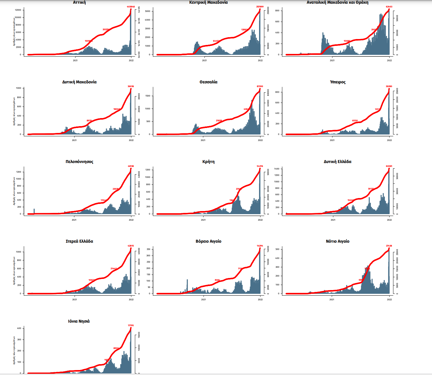 Παράρτημα 1: Επιδημικές καμπύλες κρουσμάτων COVID-19 με βάση την δηλωθείσα διεύθυνση μόνιμης κατοικίας του κρούσματος ή τη διεύθυνση προσωρινής διαμονής για τους τουρίστες και άλλους προσωρινά διαμένοντες στην Ελλάδα. Συμπεριλαμβάνονται τόσο κρούσματα με ιστορικό ταξιδίου όσο και κρούσματα με πιθανή εγχώρια μετάδοση.
