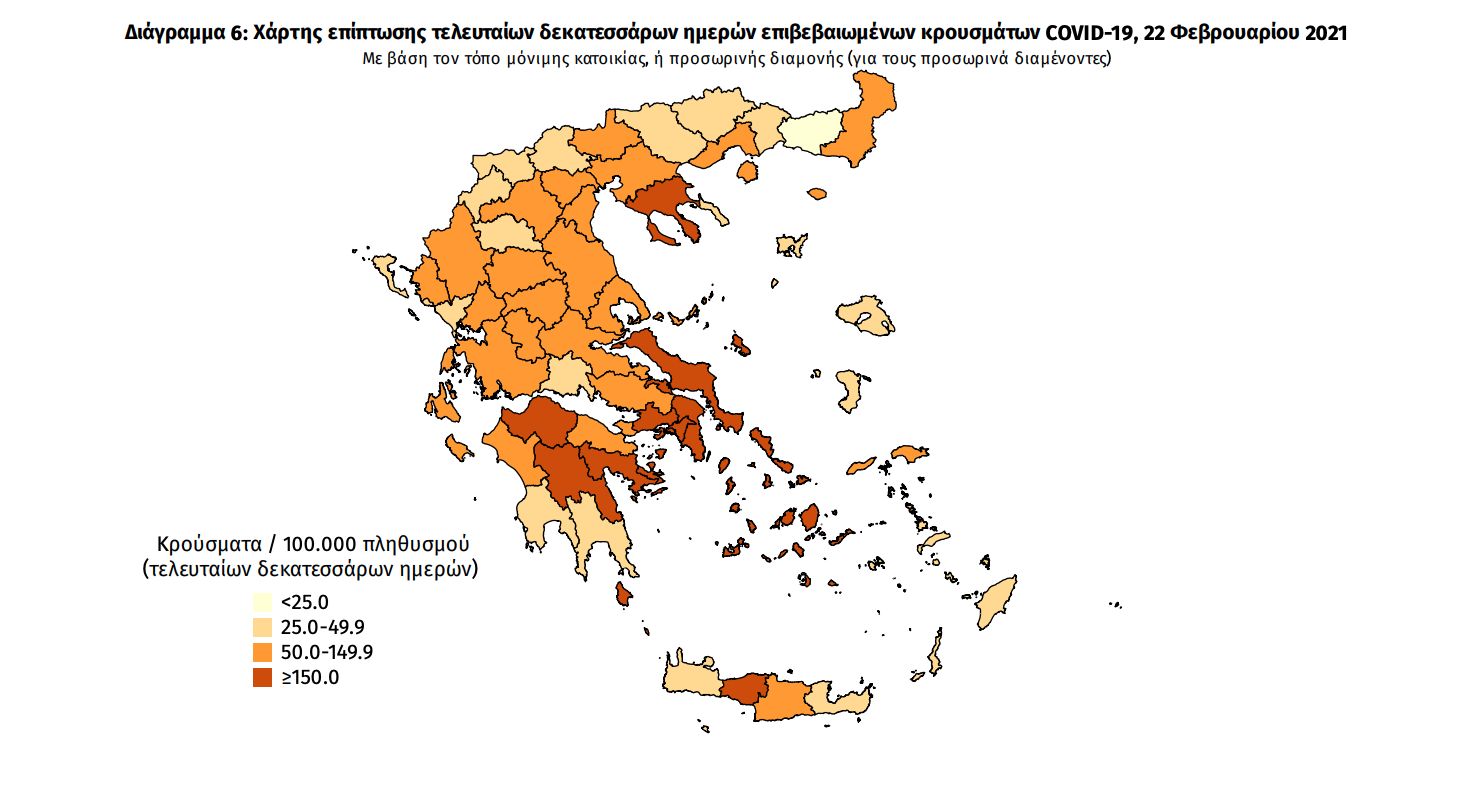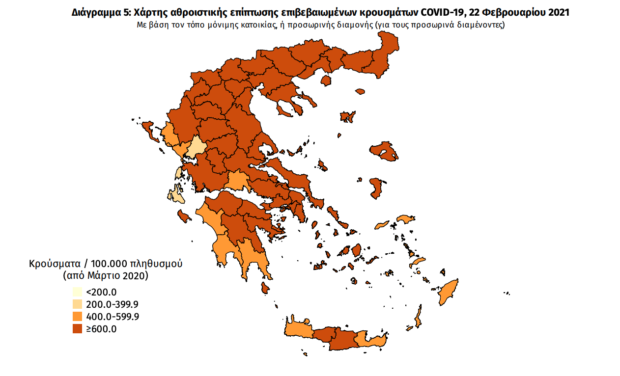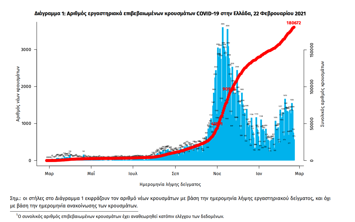 Τα στοιχεία που παρουσιάζονται αφορούν περιστατικά από την επιδημιολογική επιτήρηση της νόσου από το νέο κορωνοϊό (COVID19), με βάση τα δεδομένα που έχουν δηλωθεί στον ΕΟΔΥ και καταγραφεί μέχρι τις 22 Φεβρουαρίου 2021 (ώρα 15:00). Τα νέα εργαστηριακά επιβεβαιωμένα κρούσματα της νόσου που καταγράφηκαν τις τελευταίες 24 ώρες είναι 880, εκ των οποίων 11 εντοπίστηκαν κατόπιν ελέγχων στις πύλες εισόδου της χώρας.