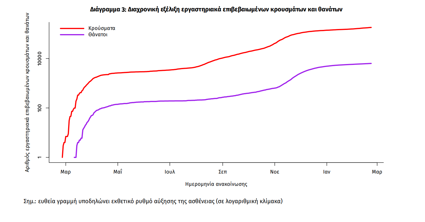 Η διαχρονική εξέλιξη των συνολικών κρουσμάτων και συνολικού αριθμού των θανάτων ασθενών COVID-19 παρουσιάζεται στο ακόλουθο διάγραμμα
