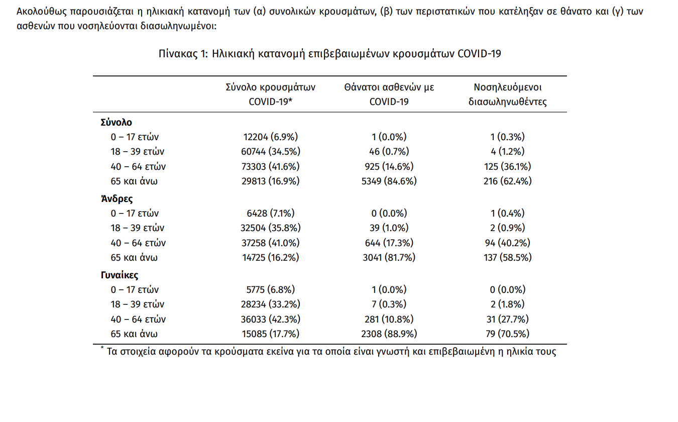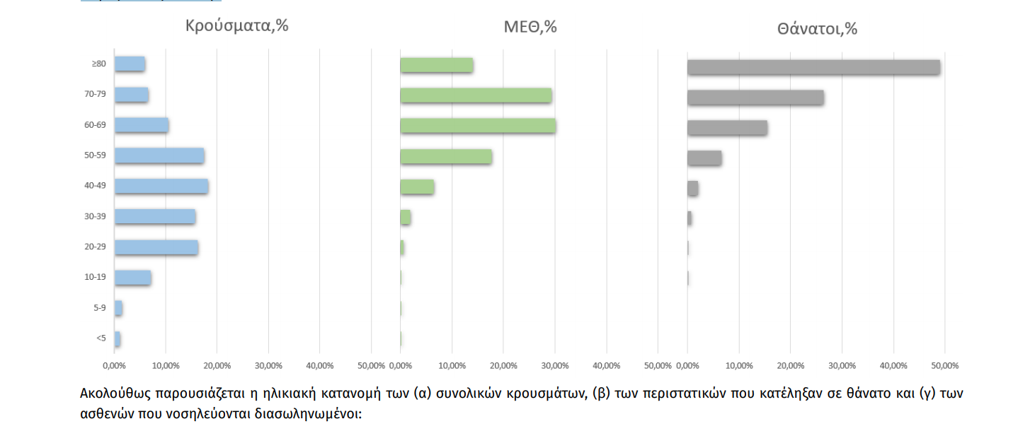 Ο αριθμός των ασθενών που νοσηλεύονται διασωληνωμένοι είναι 346 (67.3% άνδρες). Η διάμεση ηλικία τους είναι 68 έτη. To 85.5% έχει υποκείμενο νόσημα ή/και ηλικία 70 ετών και άνω. Από την αρχή της πανδημίας έχουν εξέλθει από τις ΜΕΘ 1.280 ασθενείς. Οι νέες εισαγωγές2 ασθενών Covid-19 στα νοσοκομεία της επικράτειας είναι 264 (ημερήσια μεταβολή +1.93%). Ο μέσος όρος εισαγωγών του επταημέρου είναι 233 ασθενείς. Hλικιακή κατανομή:Η διάμεση ηλικία των κρουσμάτων είναι 44 έτη (εύρος 0.2 έως 105 έτη), ενώ η διάμεση ηλικία των θανόντων είναι 79 έτη (εύρος 15 έως 103 έτη).