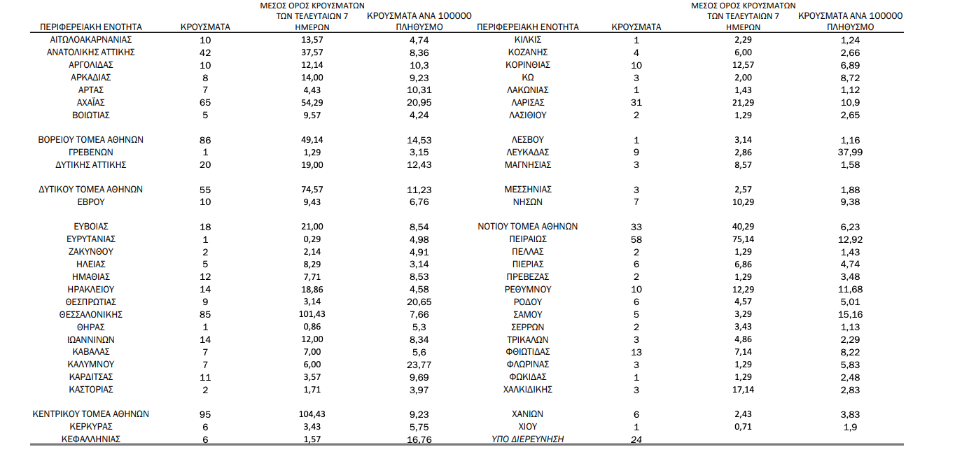 Γεωγραφική διασπορά: Ο χάρτης αποτυπώνει τη γεωγραφική κατανομή των συνολικών κρουσμάτων COVID-19 (από την αρχή της επιδημίας) ανά Περιφερειακή Ενότητα της χώρας, με βάση την δηλωθείσα διεύθυνση μόνιμης κατοικίας του ασθενούς, ή τη διεύθυνση προσωρινής διαμονής για τους τουρίστες και άλλους προσωρινά διαμένοντες στην Ελλάδα. Συμπεριλαμβάνονται τόσο κρούσματα με ιστορικό ταξιδίου (“εισαγόμενα”) όσο και κρούσματα με πιθανή εγχώρια μετάδοση.