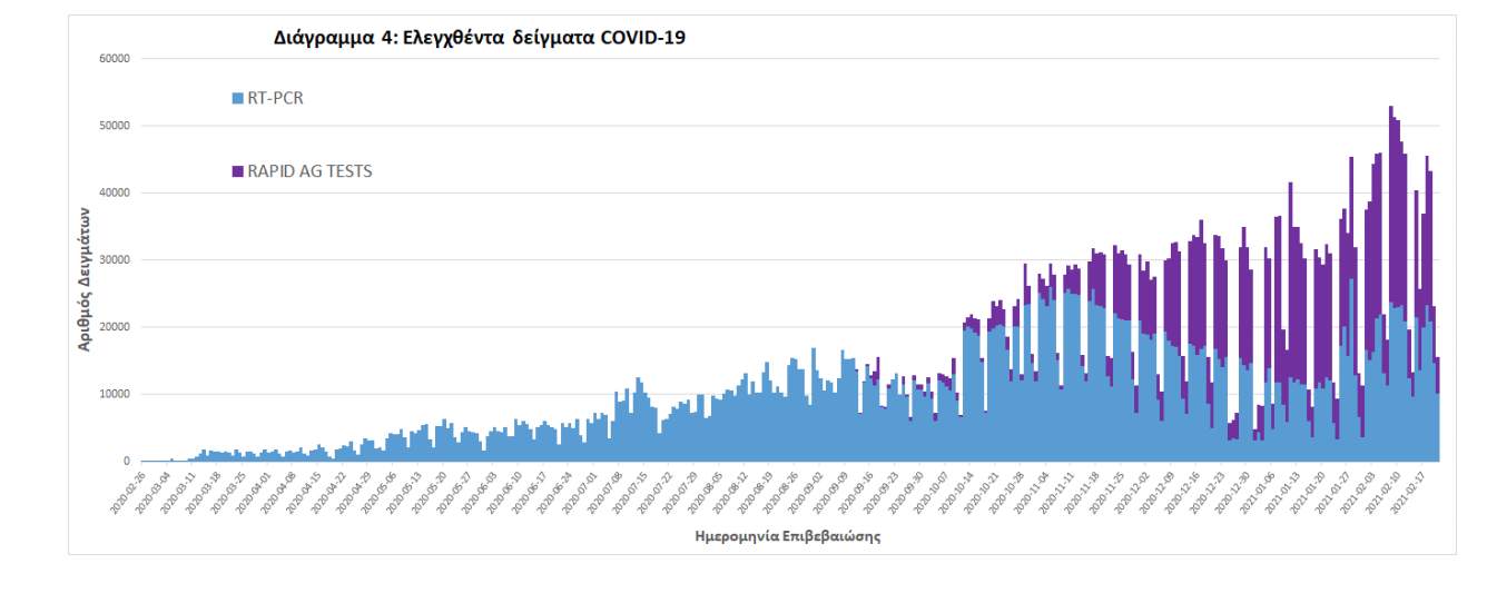 Δείγματα που έχουν ελεγχθεί: Από την 1η Ιανουαρίου 2020 μέχρι σήμερα, στα εργαστήρια που διενεργούν ελέγχους για τον νέο κορωνοϊό (SARS-CoV-2) και που δηλώνουν συστηματικά το σύνολο των δειγμάτων που ελέγχουν, έχουν συνολικά ελεγχθεί 3.513.801 κλινικά δείγματα ενώ από Μονάδες Υγείας και Κλιμάκια του ΕΟΔΥ που διενεργούν ελέγχους Rapid Ag έχουν ελεγχθεί 1.444.327 δείγματα. O μέσος όρος του επταημέρου είναι 32.984 δειγματοληπτικοί έλεγχοι.