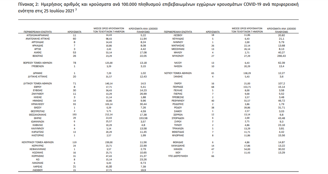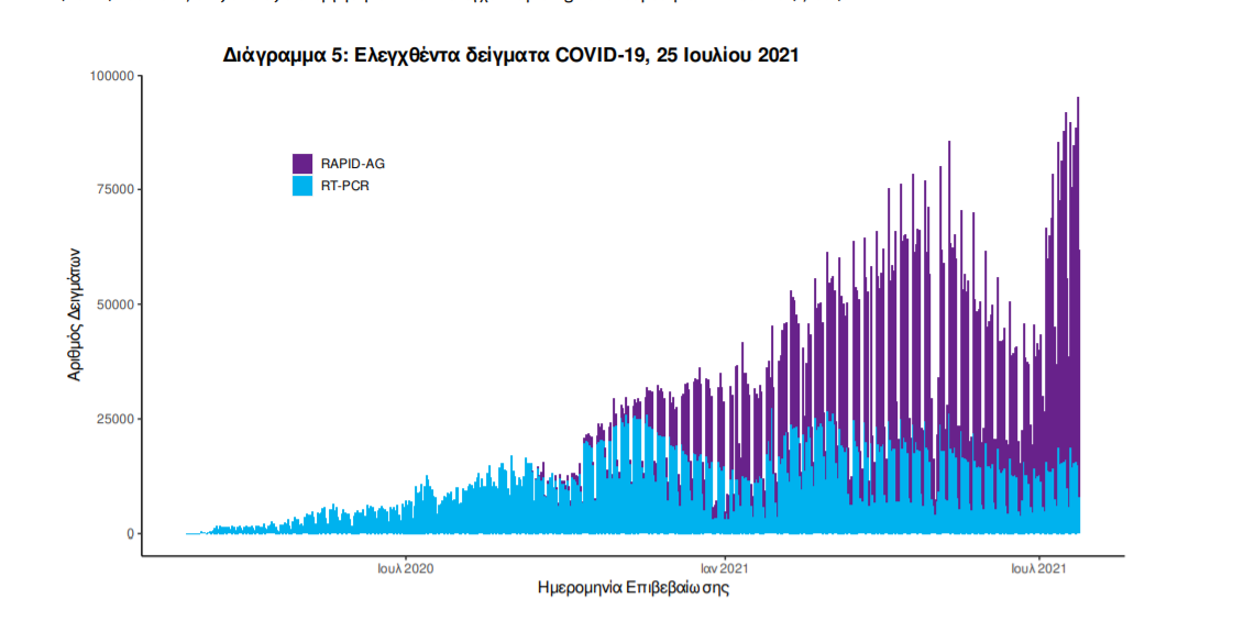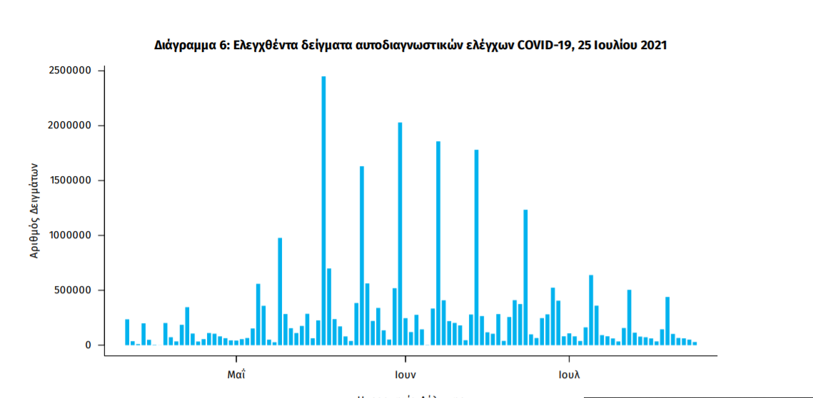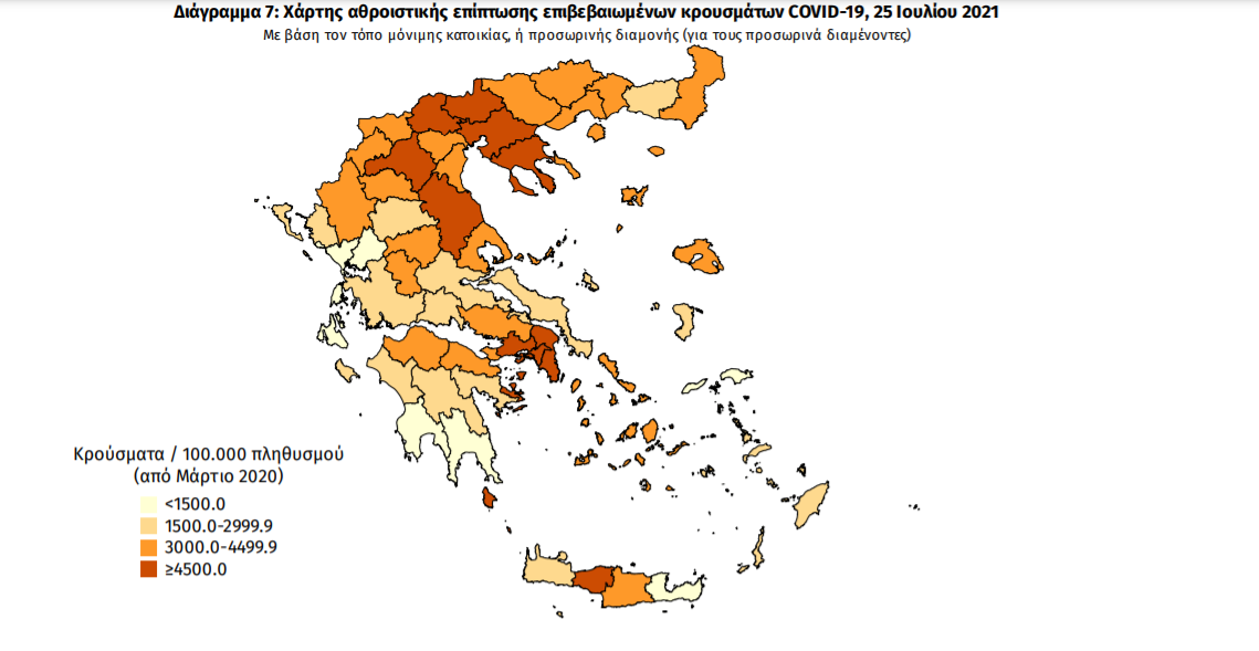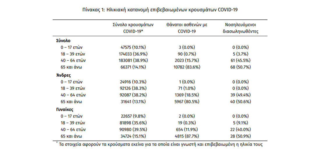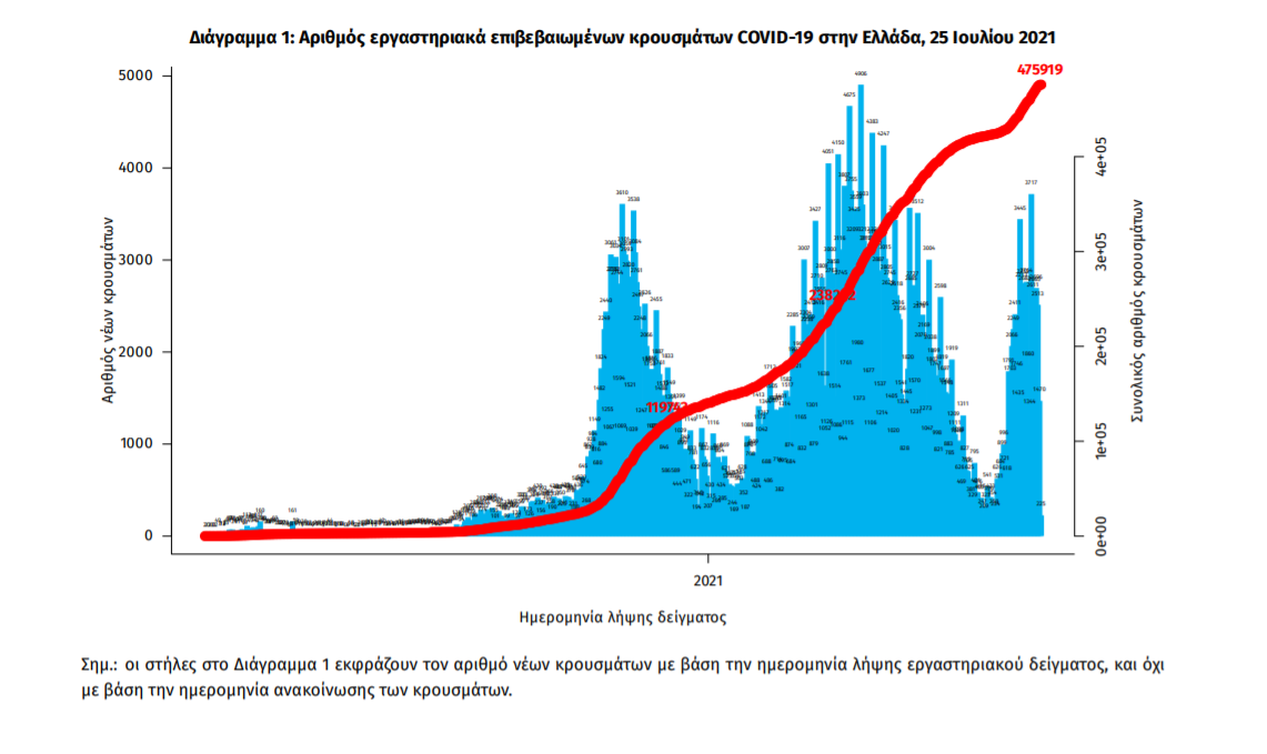 Τα νέα εργαστηριακά επιβεβαιωμένα κρούσματα της νόσου που καταγράφηκαν τις τελευταίες 24 ώρες είναι 1.553 , εκ των οποίων 8 εντοπίστηκαν κατόπιν ελέγχων στις πύλες εισόδου της χώρας. Ο συνολικός αριθμός των κρουσμάτων ανέρχεται σε 475.919 (ημερήσια μεταβολή +0.3%), εκ των οποίων 51.2% άνδρες. Με βάση τα επιβεβαιωμένα κρούσματα των τελευταίων 7 ημερών, 127 θεωρούνται σχετιζόμενα με ταξίδι από το εξωτερικό και 1.317 είναι σχετιζόμενα με ήδη γνωστό κρούσμα.