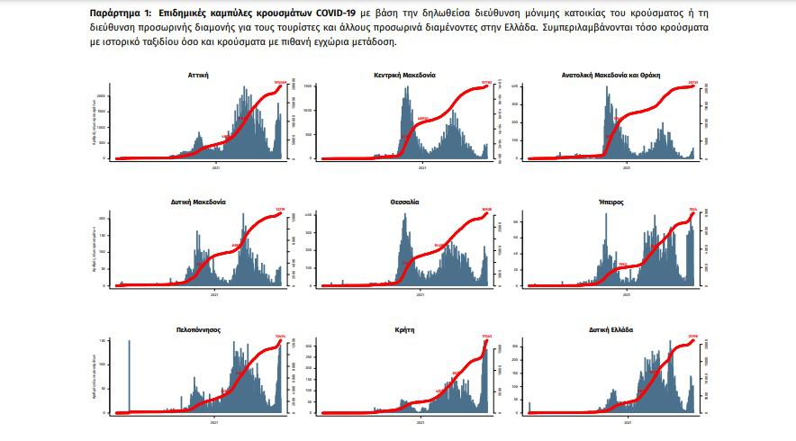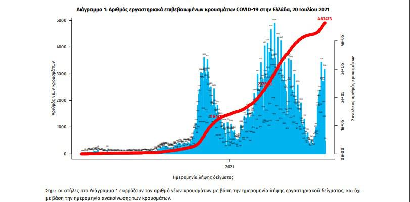 Τα νέα εργαστηριακά επιβεβαιωμένα κρούσματα της νόσου που καταγράφηκαν τις τελευταίες 24 ώρες είναι 3.565, εκ των οποίων 7 εντοπίστηκαν κατόπιν ελέγχων στις πύλες εισόδου της χώρας. Ο συνολικός αριθμός των κρουσμάτων ανέρχεται σε 463.473 (ημερήσια μεταβολή +1.0%), εκ των οποίων 51.2% άνδρες. Με βάση τα επιβεβαιωμένα κρούσματα των τελευταίων 7 ημερών, 123 θεωρούνται σχετιζόμενα με ταξίδι από το εξωτερικό και 1.318 είναι σχετιζόμενα με ήδη γνωστό κρούσμα. Ημερήσια εξέλιξη της πανδημίας: Η ημερήσια κατανομή των επιβεβαιωμένων κρουσμάτων είναι η ακόλουθη (η γραμμή παριστάνει την συνολική, αθροιστική κατανομή των κρουσμάτων).