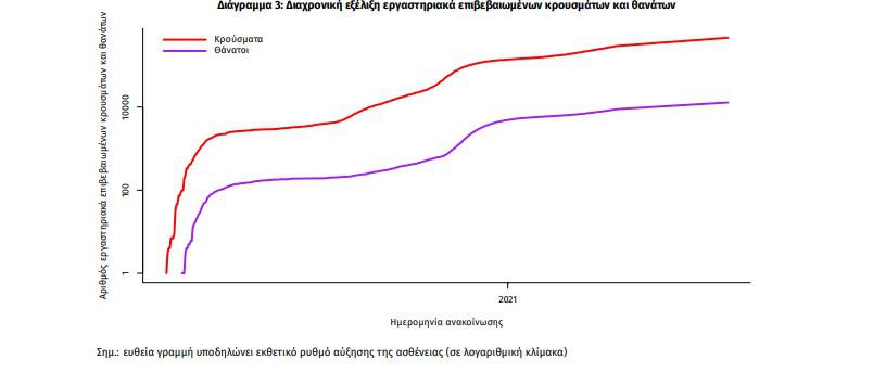 Η διαχρονική εξέλιξη των συνολικών κρουσμάτων και συνολικού αριθμού των θανάτων ασθενών COVID-19 παρουσιάζεται στο ακόλουθο διάγραμμα.