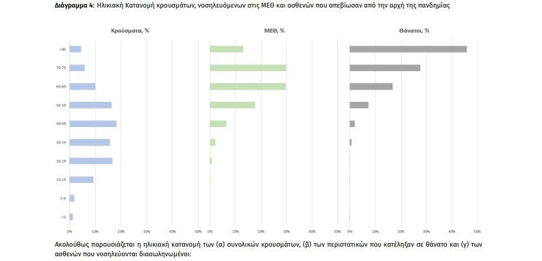 Ο αριθμός των ασθενών που νοσηλεύονται διασωληνωμένοι είναι 121 (59.5% άνδρες). Η διάμεση ηλικία τους είναι 66 έτη. To 89.3% έχει υποκείμενο νόσημα ή/και ηλικία 70 ετών και άνω. Από την αρχή της πανδημίας έχουν εξέλθει από τις ΜΕΘ 2.765 ασθενείς. Οι εισαγωγές3 νέων ασθενών Covid-19 στα νοσοκομεία της επικράτειας είναι 136 (ημερήσια μεταβολή -3.55%). Ο μέσος όρος εισαγωγών του επταημέρου είναι 121 ασθενείς. Η διάμεση ηλικία των κρουσμάτων είναι 42 έτη (εύρος 0.2 έως 106 έτη), ενώ η διάμεση ηλικία των θανόντων είναι 78 έτη (εύρος 0.2 έως 106 έτη).