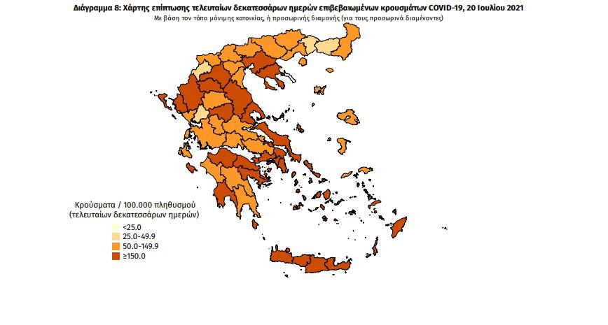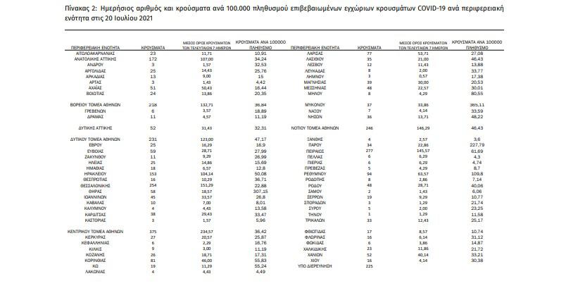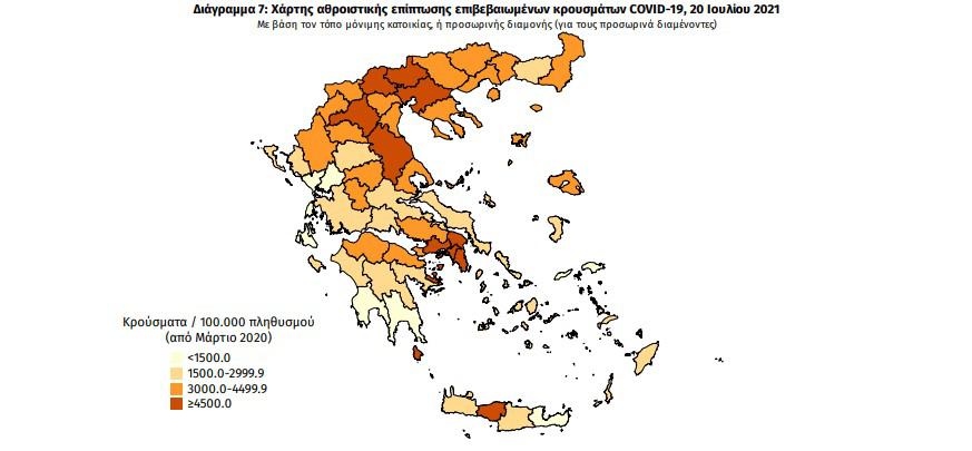 Τα στοιχεία που παρουσιάζονται αφορούν περιστατικά από την επιδημιολογική επιτήρηση της νόσου από το νέο κορωνοϊό (COVID19), με βάση τα δεδομένα που έχουν δηλωθεί στον ΕΟΔΥ και καταγραφεί μέχρι τις 20 Ιουλίου 2021 (ώρα 15:00).