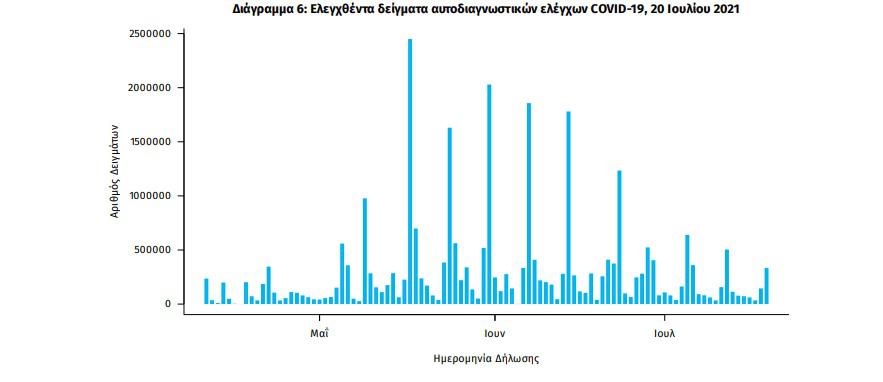 Αυτοδιαγνωστικοί έλεγχοι (Self-tests): Έως 19 Ιουλίου 2021, έχουν καταγραφεί ηλεκτρονικά 29.143.346 δηλώσεις αποτελέσματος αυτοδιαγνωστικού ελέγχου, ενώ 669.238 άτομα προσήλθαν για επανέλεγχο.