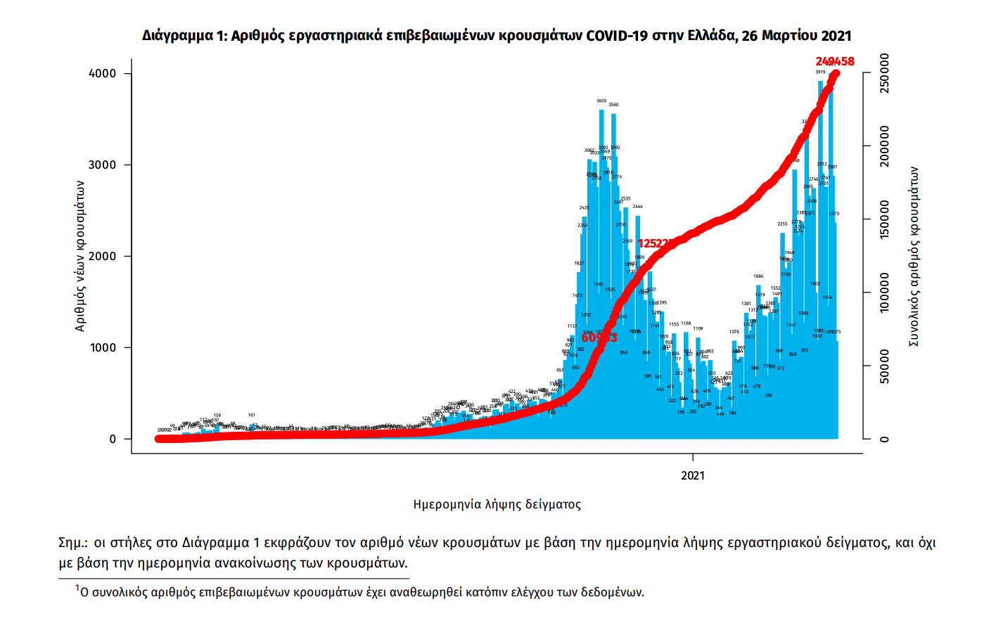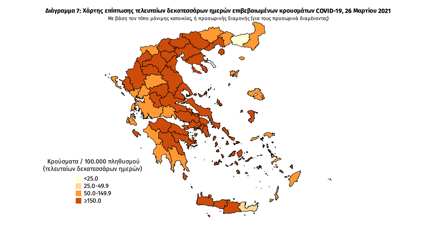 Τα στοιχεία που παρουσιάζονται αφορούν περιστατικά από την επιδημιολογική επιτήρηση της νόσου από το νέο κορωνοϊό (COVID19), με βάση τα δεδομένα που έχουν δηλωθεί στον ΕΟΔΥ και καταγραφεί μέχρι τις 26 Μαρτίου 2021 (ώρα 15:00). Τα νέα εργαστηριακά επιβεβαιωμένα κρούσματα της νόσου που καταγράφηκαν τις τελευταίες 24 ώρες είναι 1.496, εκ των οποίων 5 εντοπίστηκαν κατόπιν ελέγχων στις πύλες εισόδου της χώρας.