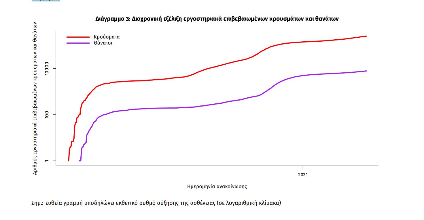 Η διαχρονική εξέλιξη των συνολικών κρουσμάτων και συνολικού αριθμού των θανάτων ασθενών COVID-19 παρουσιάζεται στο ακόλουθο διάγραμμα.