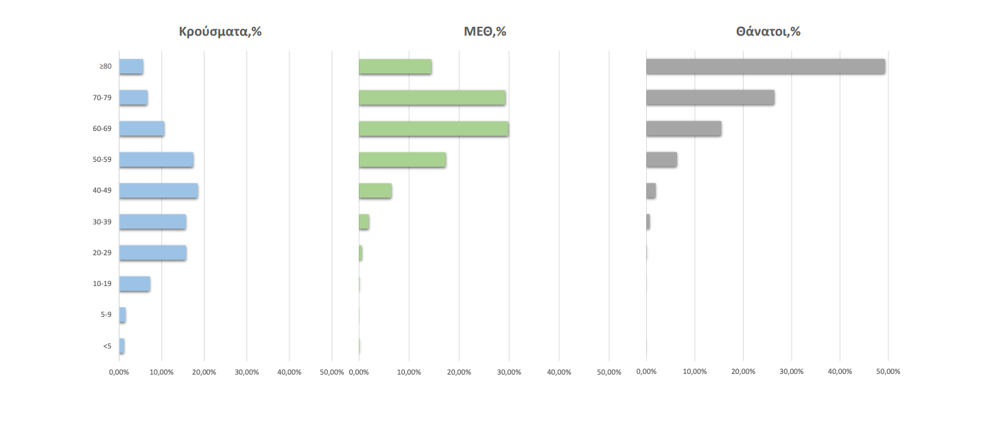 Ακολούθως παρουσιάζεται η ηλικιακή κατανομή των (α) συνολικών κρουσμάτων, (β) των περιστατικών που κατέληξαν σε θάνατο και (γ) των ασθενών που νοσηλεύονται διασωληνωμένοι: