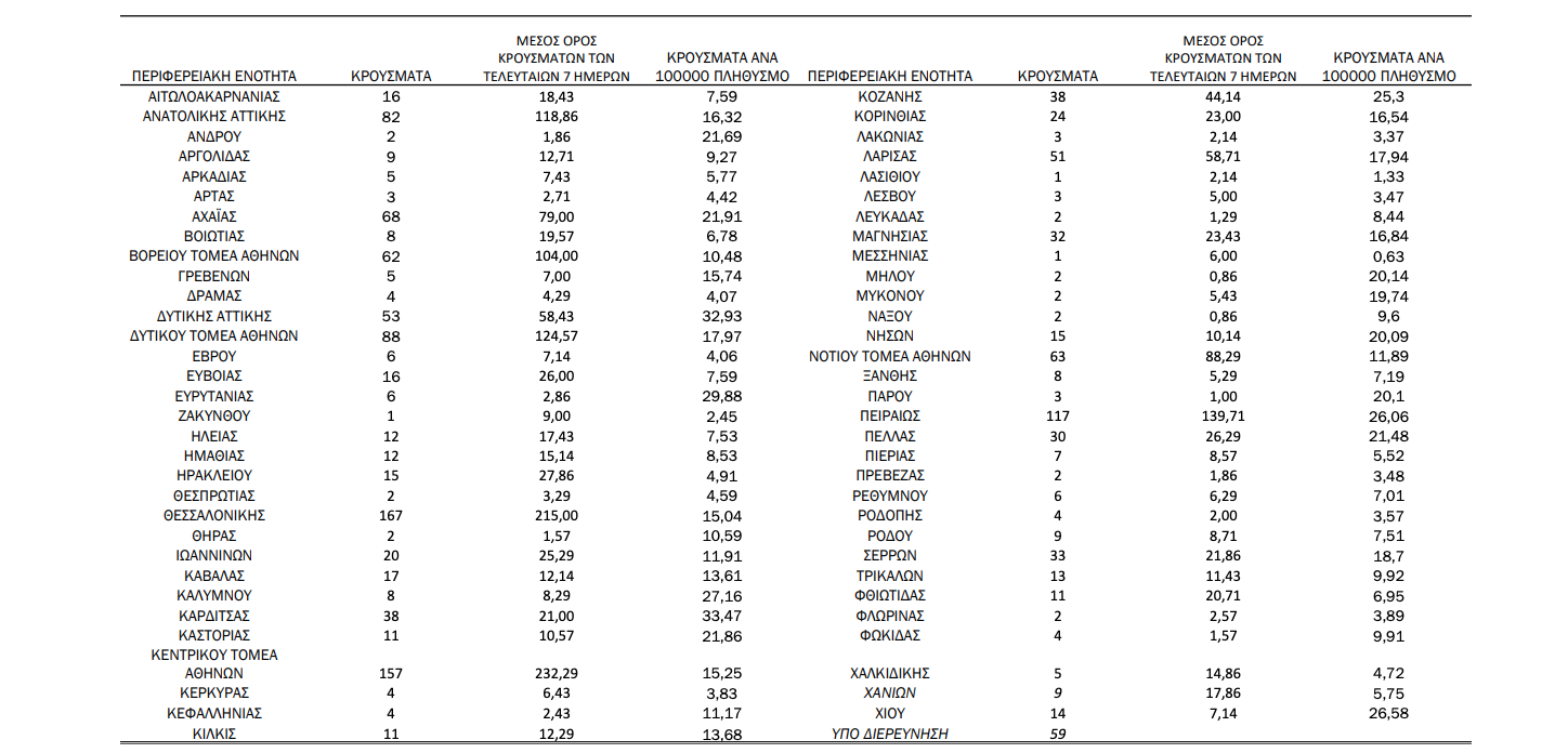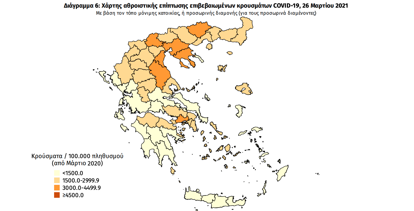 Γεωγραφική διασπορά: Ο χάρτης αποτυπώνει τη γεωγραφική κατανομή των συνολικών κρουσμάτων COVID-19 (από την αρχή της επιδημίας) ανά Περιφερειακή Ενότητα της χώρας, με βάση την δηλωθείσα διεύθυνση μόνιμης κατοικίας του ασθενούς, ή τη διεύθυνση προσωρινής διαμονής για τους τουρίστες και άλλους προσωρινά διαμένοντες στην Ελλάδα. Συμπεριλαμβάνονται τόσο κρούσματα με ιστορικό ταξιδίου (“εισαγόμενα”) όσο και κρούσματα με πιθανή εγχώρια μετάδοση.