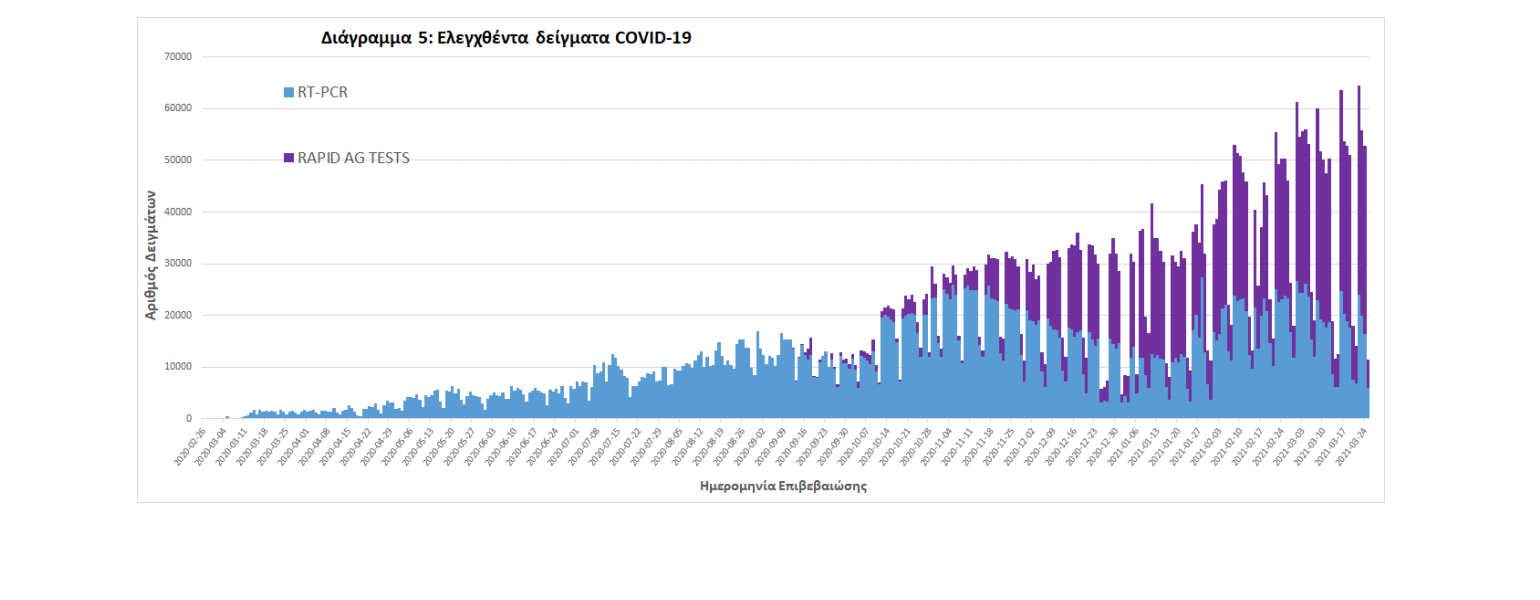 Δείγματα που έχουν ελεγχθεί: Από την 1η Ιανουαρίου 2020 μέχρι σήμερα, στα εργαστήρια που διενεργούν ελέγχους για τον νέο κορωνοϊό (SARS-CoV-2) και που δηλώνουν συστηματικά το σύνολο των δειγμάτων που ελέγχουν, έχουν συνολικά ελεγχθεί 4.093.890 κλινικά δείγματα ενώ από Μονάδες Υγείας και Κλιμάκια του ΕΟΔΥ που διενεργούν ελέγχους Rapid Ag έχουν ελεγχθεί 2.224.899 δείγματα. O μέσος όρος του επταημέρου είναι 38.270 δειγματοληπτικοί έλεγχοι.
