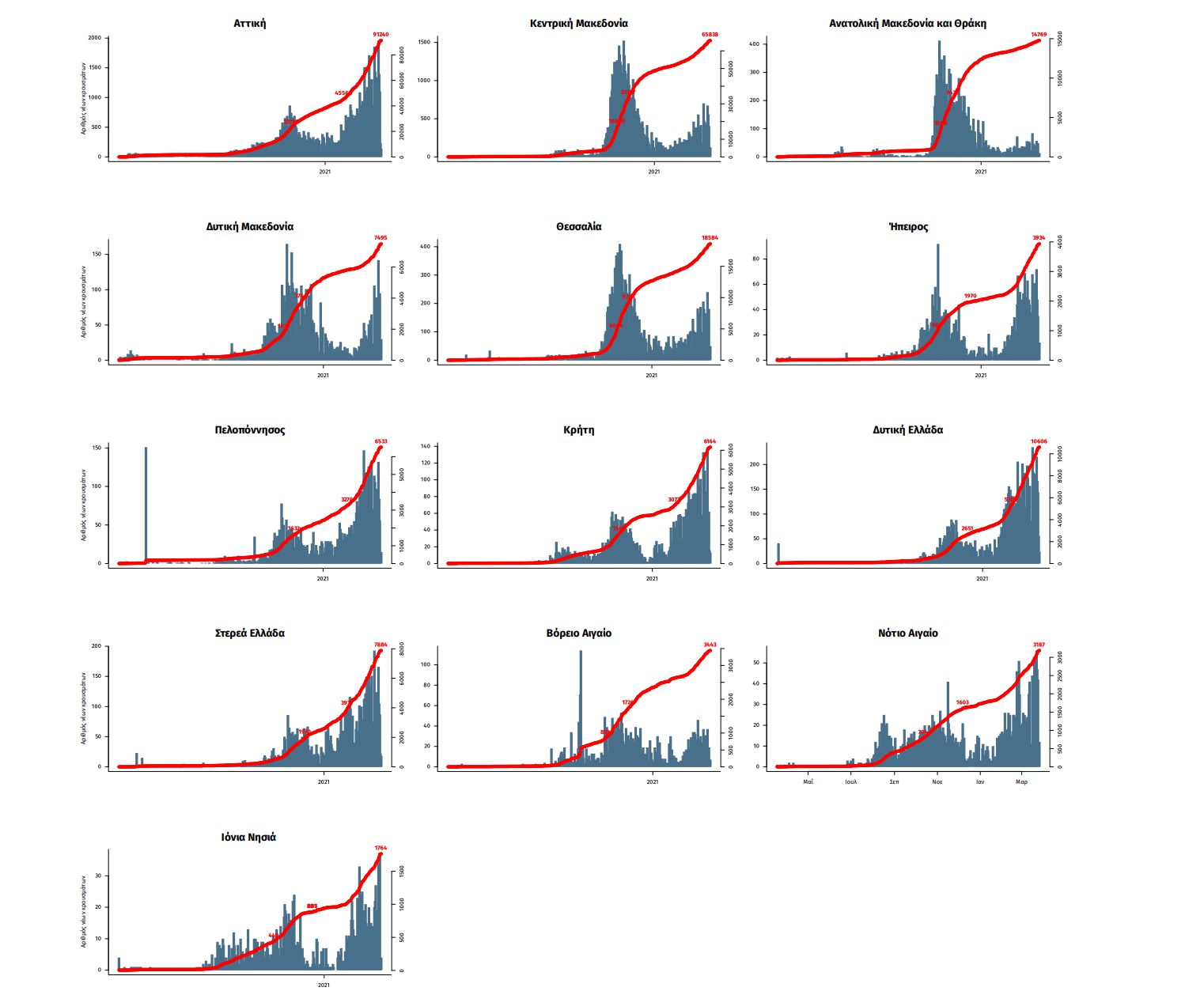 Παράρτημα 1: Επιδημικές καμπύλες κρουσμάτων COVID-19 με βάση την δηλωθείσα διεύθυνση μόνιμης κατοικίας του κρούσματος ή τη διεύθυνση προσωρινής διαμονής για τους τουρίστες και άλλους προσωρινά διαμένοντες στην Ελλάδα. Συμπεριλαμβάνονται τόσο κρούσματα με ιστορικό ταξιδίου όσο και κρούσματα με πιθανή εγχώρια μετάδοση.