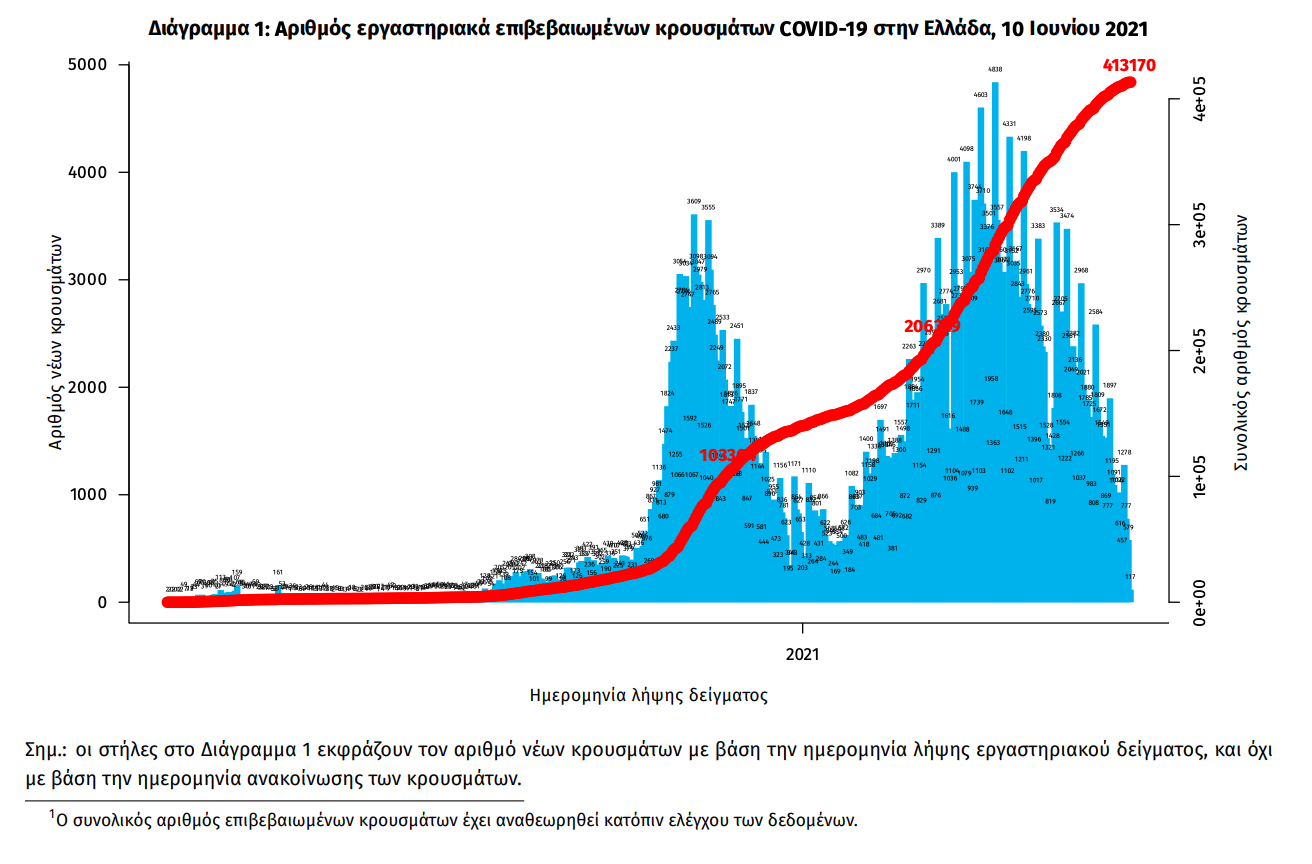 Τα στοιχεία που παρουσιάζονται αφορούν περιστατικά από την επιδημιολογική επιτήρηση της νόσου από το νέο κορωνοϊό (COVID19), με βάση τα δεδομένα που έχουν δηλωθεί στον ΕΟΔΥ και καταγραφεί μέχρι τις 10 Ιουνίου 2021 (ώρα 15:00). Τα νέα εργαστηριακά επιβεβαιωμένα κρούσματα της νόσου που καταγράφηκαν τις τελευταίες 24 ώρες είναι 781, εκ των οποίων 2 εντοπίστηκαν κατόπιν ελέγχων στις πύλες εισόδου της χώρας.