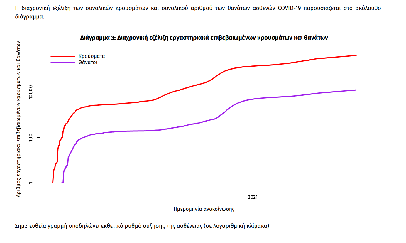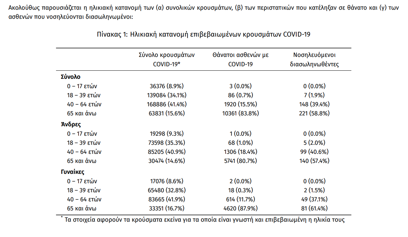 Ο αριθμός των ασθενών που νοσηλεύονται διασωληνωμένοι είναι 376 (64.8% άνδρες). Η διάμεση ηλικία τους είναι 67 έτη. To 88.0% έχει υποκείμενο νόσημα ή/και ηλικία 70 ετών και άνω. Από την αρχή της πανδημίας έχουν εξέλθει από τις ΜΕΘ 2.539 ασθενείς. Οι εισαγωγές2 νέων ασθενών Covid-19 στα νοσοκομεία της επικράτειας είναι 102 (ημερήσια μεταβολή -3.77%). Ο μέσος όρος εισαγωγών του επταημέρου είναι 133 ασθενείς.Η διάμεση ηλικία των κρουσμάτων είναι 43 έτη (εύρος 0.2 έως 106 έτη), ενώ η διάμεση ηλικία των θανόντων είναι 78 έτη (εύρος 0.2 έως 106 έτη).