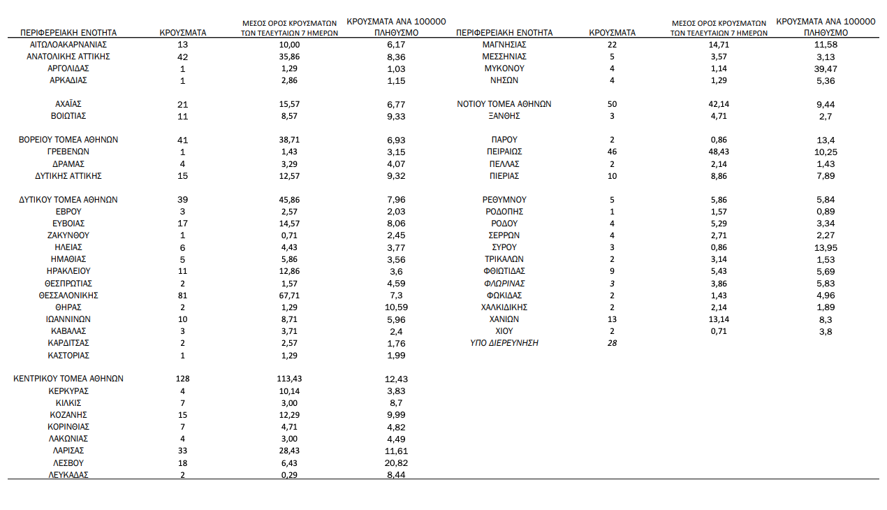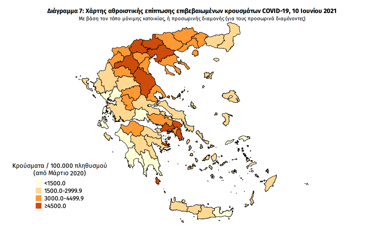 Γεωγραφική διασπορά: Ο χάρτης αποτυπώνει τη γεωγραφική κατανομή των συνολικών κρουσμάτων COVID-19 (από την αρχή της επιδημίας) ανά Περιφερειακή Ενότητα της χώρας, με βάση την δηλωθείσα διεύθυνση μόνιμης κατοικίας του ασθενούς, ή τη διεύθυνση προσωρινής διαμονής για τους τουρίστες και άλλους προσωρινά διαμένοντες στην Ελλάδα. Συμπεριλαμβάνονται τόσο κρούσματα με ιστορικό ταξιδίου (“εισαγόμενα”) όσο και κρούσματα με πιθανή εγχώρια μετάδοση.