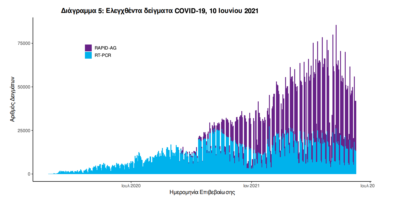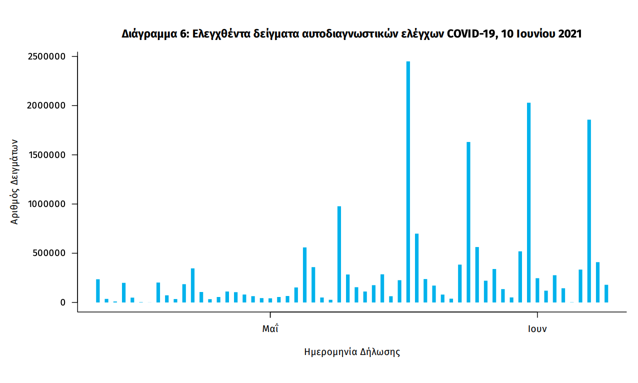 Δείγματα που έχουν ελεγχθεί: Από την 1η Ιανουαρίου 2020 μέχρι σήμερα, στα εργαστήρια που διενεργούν ελέγχους για τον νέο κορωνοϊό (SARS-CoV-2) και που δηλώνουν συστηματικά το σύνολο των δειγμάτων που ελέγχουν, έχουν συνολικά ελεγχθεί 5.205.455 κλινικά δείγματα ενώ από Μονάδες Υγείας και Κλιμάκια του ΕΟΔΥ που διενεργούν ελέγχους Rapid Ag έχουν ελεγχθεί 4.746.761 δείγματα. O μέσος όρος του επταημέρου είναι 39.796 δειγματοληπτικοί έλεγχοι. Αυτοδιαγνωστικοί έλεγχοι (Self-tests): Έως 09 Ιουνίου 2021, έχουν καταγραφεί ηλεκτρονικά 18.673.290 δηλώσεις αποτελέσματος αυτοδιαγνωστικού ελέγχου, ενώ 347.753 άτομα προσήλθαν για επανέλεγχο. Mαζικές Δειγματοληψίες ΕΟΔΥ: Στις 09 Ιουνίου 2021, πραγματοποιήθηκαν 140 δράσεις δειγματοληπτικών ελέγχων από τις Κινητές Ομάδες Υγείας (ΚΟΜΥ) του ΕΟΔΥ, στις οποίες διενεργήθηκαν 10.133 έλεγχοι Rapid Ag και ανευρέθηκαν 103 θετικά (1,02%).