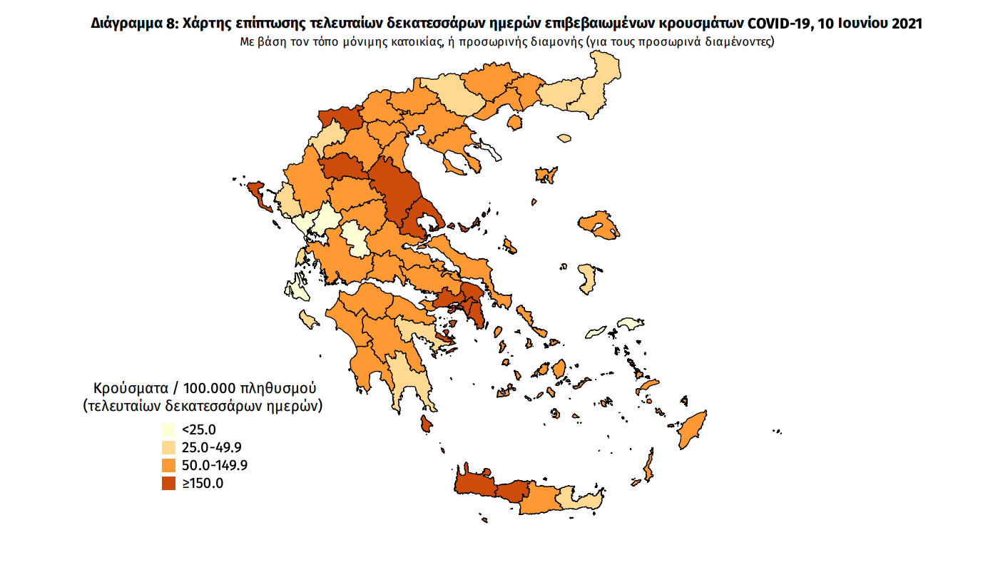 Κατανομή ανακοινωθέντων εγχώριων κρουσμάτων: Από το σύνολο των 781 νέων κρουσμάτων του νέου ιού στη χώρα 4 είναι εισαγόμενα εκ των οποίων 2 εντοπίστηκαν κατόπιν ελέγχων στις πύλες εισόδου της χώρας Η κατανομή των 777 νέων εγχώριων κρουσμάτων ανά Περιφερειακή Ενότητα παρουσιάζεται στον κατωτέρω πίνακα.3 Πίνακας 2: Ημερήσιος αριθμός και κρούσματα ανά 100.000 πληθυσμού επιβεβαιωμένων εγχώριων κρουσμάτων COVID-19 ανά περιφερειακή ενότητα στις 10 Ιουνίου 2021