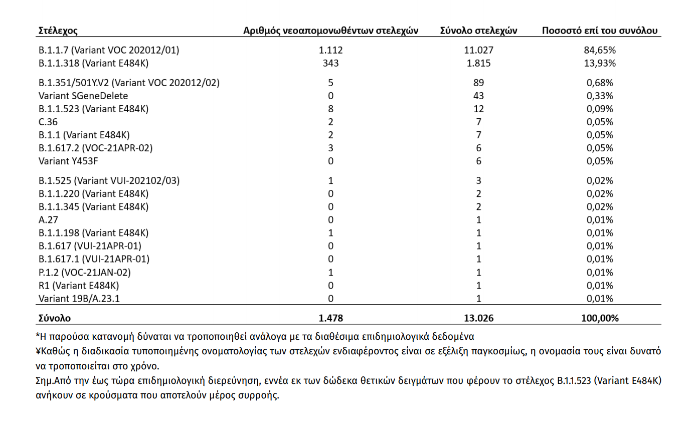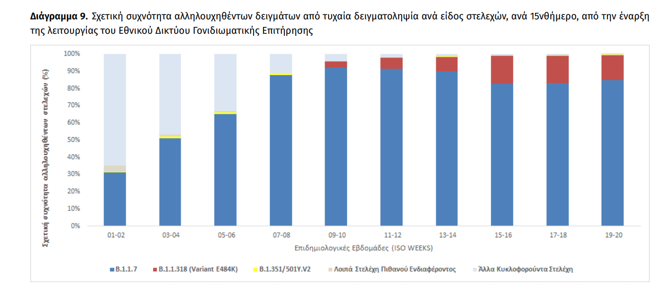 Eθνικό Δίκτυο Γονιδιωματικής Επιτήρησης ΕΟΔΥ για τις μεταλλάξεις του SARS-CoV-2 Ολοκληρώθηκε από το Eθνικό Δίκτυο Γονιδιωματικής Επιτήρησης του ιού SARS-CoV-2, που λειτουργεί υπό το συντονισμό του ΕΟΔΥ, η γονιδιωματική ανάλυση σε 1.567 δείγματα που έχουν επιλεγεί τυχαιοποιημένα ή στοχευμένα και αφορούν στην περίοδο 15 Απριλίου έως 27 Μαΐου 2021. Από τον έλεγχο των 1.567 δειγμάτων, αναδείχθηκαν συνολικά 1.121 δείγματα με στελέχη ειδικού ενδιαφέροντος (Variants Of Concern – VOC) και 345 δείγματα με στελέχη υπό παρακολούθηση (Variants Under Monitoring). Εκ των 1.121 δειγμάτων με στελέχη ειδικού ενδιαφέροντος, τα 1.112 αφορούν στο Β.1.1.7 (Variant VOC 202012/01), 5 αφορούν στο B.1.351/501Y.V2 (Variant VOC 202012/02), 3 αφορούν στο B.1.617.2 (VOC-21APR-02) και 1 αφορά στο P.1.2 (VOC-21JAN-02). Εκ των 345 δειγμάτων με στελέχη υπό παρακολούθηση, τα 343 αφορούν στο στέλεχος B.1.1.318 (Variant E484K) και 2 αφορούν στο C.36. Επιπλέον, αναδείχθηκαν 8 δείγματα με στέλεχος B.1.1.523 (Variant E484K), 2 με το Β.1.1 (Variant E484K), 1 με B.1.525 (Variant VUI-202102/03) και 1 με B.1.1.198 (Variant E484K) (Πίνακας 3). Από την έναρξη λειτουργίας του Εθνικού Δικτύου Γονιδιωματικής Επιτήρησης του ιού SARS-CoV-2 μέχρι σήμερα έχουν ελεγχθεί στην επικράτεια συνολικά 15.909 δείγματα από εγχώρια κρούσματα. Εξ αυτών 13.931 προέρχονται από τυχαία επιλογή δειγμάτων, 1.325 προέρχονται από στοχευμένη λήψη ή επιλογή δειγμάτων και για 653 δείγματα δεν είναι διαθέσιμος ο τρόπος επιλογής. Μεταξύ των 13.931 τυχαία επιλεγμένων δειγμάτων στην επικράτεια, τα τρία πιο συχνά στελέχη ειδικού ενδιαφέροντος ή υπό διερεύνηση που έχουν απομονωθεί είναι το Β.1.1.7 (Variant VOC 202012/01), με ποσοστό 77,10%, ακολουθούμενο από το B.1.1.318 (Variant E484K) με ποσοστό 7,62% και το B.1.351/501Y.V2 (Variant VOC 202012/02) με ποσοστό 0,32% (Πίνακας 4). Η διαχρονική εξέλιξη της σχετικής συχνότητας των αλληλουχηθέντων δειγμάτων από τυχαία δειγματοληψία ανά είδος στελεχών, μέχρι και την εβδομάδα 20 απεικονίζεται στο Διάγραμμα 1. Από τα 1.325 δείγματα που έχουν ληφθεί ή επιλεγεί στοχευμένα, έχουν βρεθεί 1.185 στελέχη ειδικού ενδιαφέροντος ή υπό παρακολούθηση, εκ των οποίων 29,28% αφορούν στο στέλεχος Β.1.1.7 (Variant VOC 202012/01), 64,98% στο B.1.1.318 (Variant E484K) και 3,46% στο B.1.351/501Y.V2 (Variant VOC 202012/02). Επιπλέον, έχουν απομονωθεί συνολικά 106 στελέχη ειδικού ενδιαφέροντος ή υπό διερεύνηση ή ενδιαφέροντος από δείγματα εισαγόμενων κρουσμάτων, εκ των οποίων 100 αφορούν στο Β.1.1.7 (Variant VOC-202012/01), 4 στο B.1.351/501Y.V2 (Variant VOC 202012/02), 1 στο B.1.525 (Variant VUI-202102/03) και 1 στο Β.1.617.1 (VUI-21APR-01). Πίνακας 3*¥. Απόλυτη και σχετική συχνότητα στελεχών ειδικού ενδιαφέροντος/υπό διερεύνηση/υπό παρακολούθηση ή άλλα στελέχη ενδιαφέροντος του ιού SARS CoV-2 (τυχαία και στοχευμένη δειγματοληψία) από την έναρξη λειτουργίας του Εθνικού Δικτύου Γονιδιωματικής Επιτήρησης του ιού SARS-CoV-2 μέχρι σήμερα