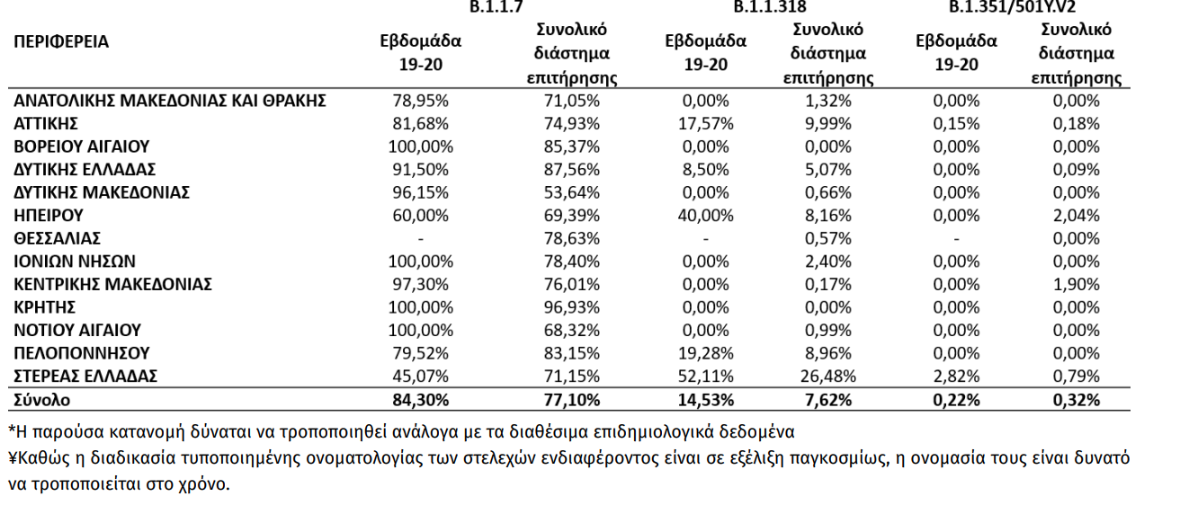 Σημ. 1. Στα “Άλλα Κυκλοφορούντα Στελέχη” περιλαμβάνονται τα παλαιότερα στελέχη που κυκλοφορούσαν κατά την πρώτη και δεύτερη πανδημική περίοδο και τα οποία δεν φέρουν ανησυχητικές μεταλλάξεις (π.χ. del 69-70, N501Y, E484K, L452R κλπ.) που σχετίζονται με αυξημένη μεταδοτικότητα ή μολυσματικότητα ή διαφυγή ή διαγνωστικά ζητήματα Σημ. 2. Στα “Λοιπά Στελέχη Πιθανού Ενδιαφέροντος” περιλαμβάνονται όλα τα στελέχη του πίνακα 3 εκτός των Β.1.1.7, B.1.1.318 (Variant E484K) και B.1.351/501Y.V2. Πίνακας 4*¥. Ποσοστό εγχώριων θετικών δειγμάτων για τα τρία συχνότερα στελέχη ειδικού ενδιαφέροντος ή υπό παρακολούθηση του ιού SARS-CoV-2 επί του συνόλου των ελεγχθέντων δειγμάτων από τυχαία δειγματοληψία, ανά Περιφέρεια για το 15νθήμερο από 10/05/2021 έως 23/05/2021 και για το χρονικό διάστημα από την έναρξη λειτουργίας του Εθνικού Δικτύου Γονιδιωματικής Επιτήρησης του ιού SARS-CoV-2 μέχρι σήμερα.