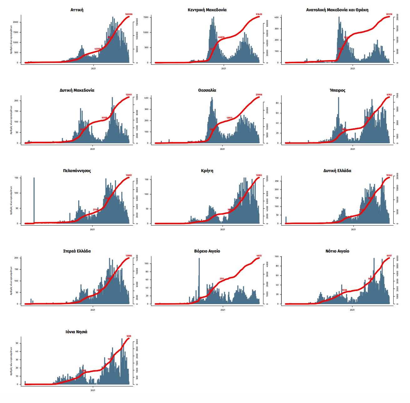 Παράρτημα 1: Επιδημικές καμπύλες κρουσμάτων COVID-19 με βάση την δηλωθείσα διεύθυνση μόνιμης κατοικίας του κρούσματος ή τη διεύθυνση προσωρινής διαμονής για τους τουρίστες και άλλους προσωρινά διαμένοντες στην Ελλάδα. Συμπεριλαμβάνονται τόσο κρούσματα με ιστορικό ταξιδίου όσο και κρούσματα με πιθανή εγχώρια μετάδοση.