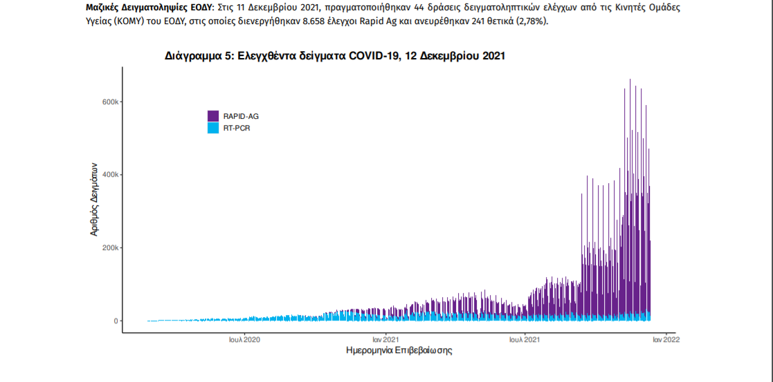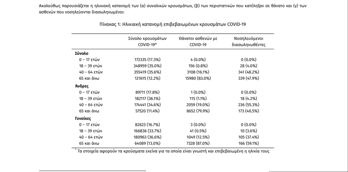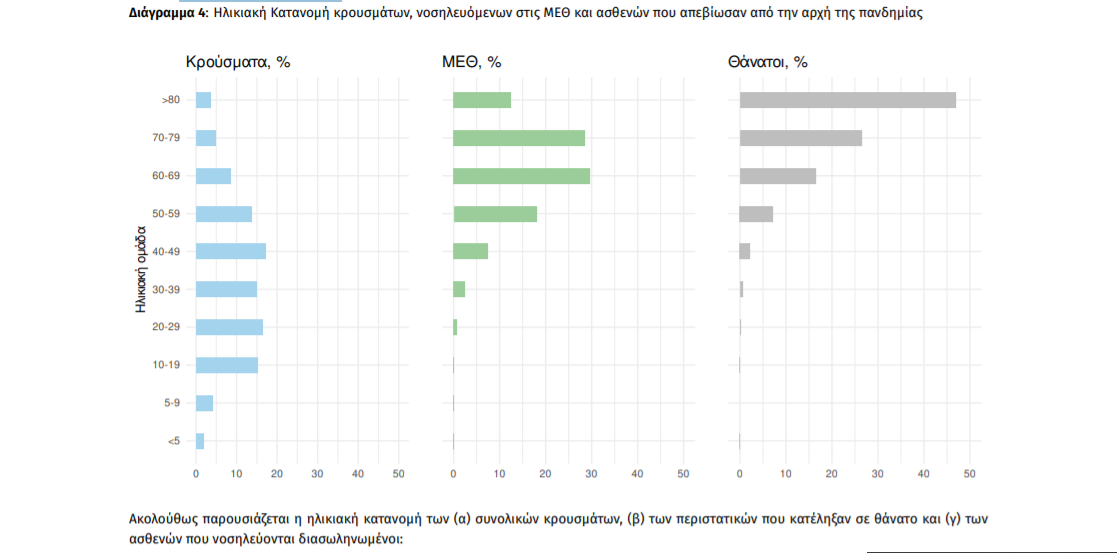 Ο αριθμός των ασθενών που νοσηλεύονται διασωληνωμένοι είναι 708 (59.9% άνδρες). Η διάμεση ηλικία τους είναι 64 έτη. To 79.0% έχει υποκείμενο νόσημα ή/και ηλικία 70 ετών και άνω. Μεταξύ των ασθενών που νοσηλεύονται διασωληνωμένοι, 570 (80.51%) είναι ανεμβολίαστοι ή μερικώς εμβολιασμένοι και 138 (19.49%) είναι πλήρως εμβολιασμένοι. Από την αρχή της πανδημίας έχουν εξέλθει από τις ΜΕΘ 3.613 ασθενείς. Οι εισαγωγές νέων ασθενών Covid-19 στα νοσοκομεία της επικράτειας είναι 407 (ημερήσια μεταβολή +15.3%). Ο μέσος όρος εισαγωγών του επταημέρου είναι 400 ασθενείς.Η διάμεση ηλικία των κρουσμάτων είναι 38 έτη (εύρος 0.2 έως 106 έτη), ενώ η διάμεση ηλικία των θανόντων είναι 78 έτη (εύρος 0.2 έως 106 έτη)