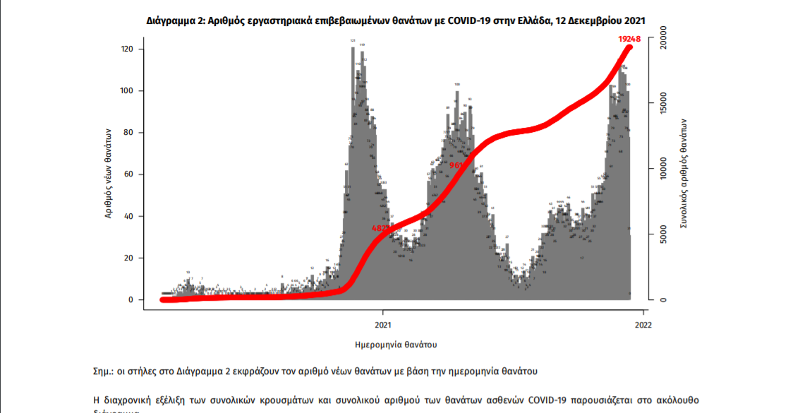 Οι νέοι θάνατοι ασθενών με COVID-19 είναι 90, ενώ από την έναρξη της επιδημίας έχουν καταγραφεί συνολικά 19.248 θάνατοι. Το 95.3% είχε υποκείμενο νόσημα ή/και ηλικία 70 ετών και άνω