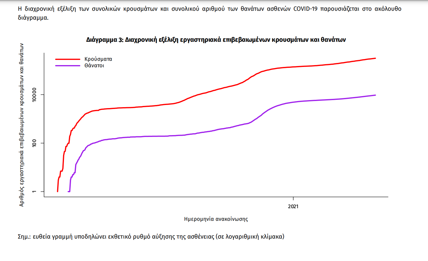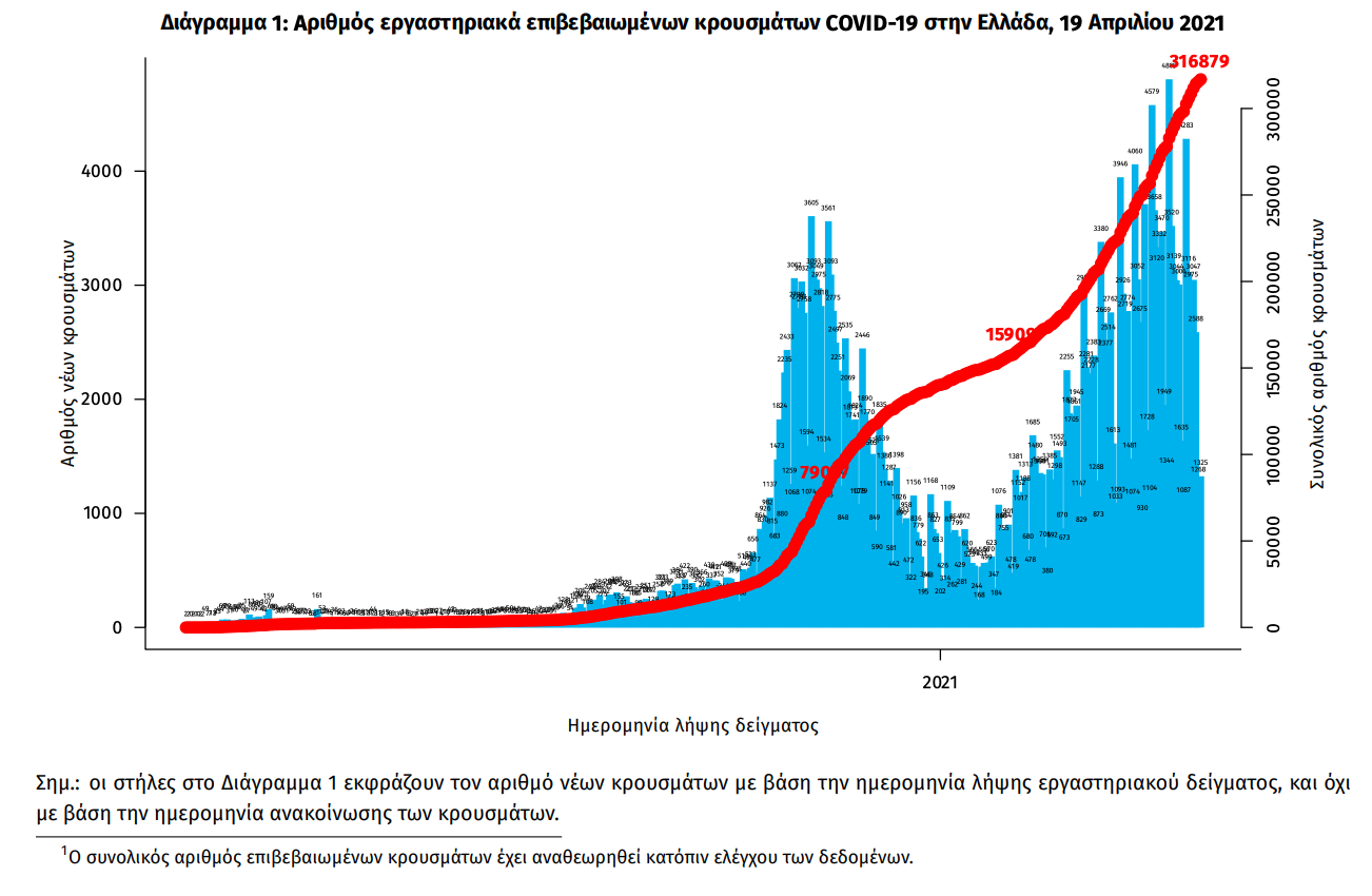 Τα στοιχεία που παρουσιάζονται αφορούν περιστατικά από την επιδημιολογική επιτήρηση της νόσου από το νέο κορωνοϊό (COVID19), με βάση τα δεδομένα που έχουν δηλωθεί στον ΕΟΔΥ και καταγραφεί μέχρι τις 19 Απριλίου 2021 (ώρα 15:00). Τα νέα εργαστηριακά επιβεβαιωμένα κρούσματα της νόσου που καταγράφηκαν τις τελευταίες 24 ώρες είναι 1.607, εκ των οποίων 7 εντοπίστηκαν κατόπιν ελέγχων στις πύλες εισόδου της χώρας. Ο συνολικός αριθμός των κρουσμάτων ανέρχεται σε 316.879 (ημερήσια μεταβολή +0.5%), εκ των οποίων 51.3% άνδρες. 1 Με βάση τα επιβεβαιωμένα κρούσματα των τελευταίων 7 ημερών, 59 θεωρούνται σχετιζόμενα με ταξίδι από το εξωτερικό και 3.072 είναι σχετιζόμενα με ήδη γνωστό κρούσμα. Ημερήσια εξέλιξη της πανδημίας: Η ημερήσια κατανομή των επιβεβαιωμένων κρουσμάτων είναι η ακόλουθη (η γραμμή παριστάνει την συνολική, αθροιστική κατανομή των κρουσμάτων).
