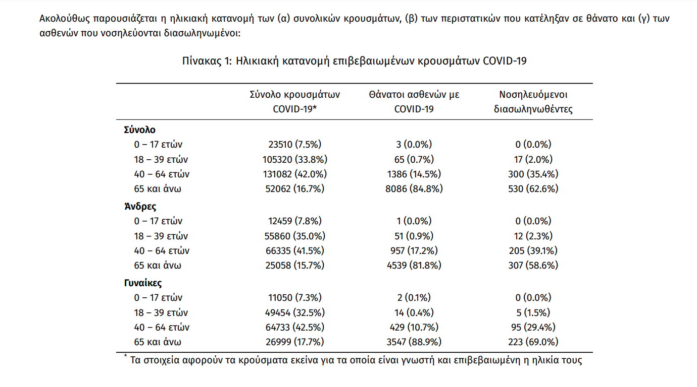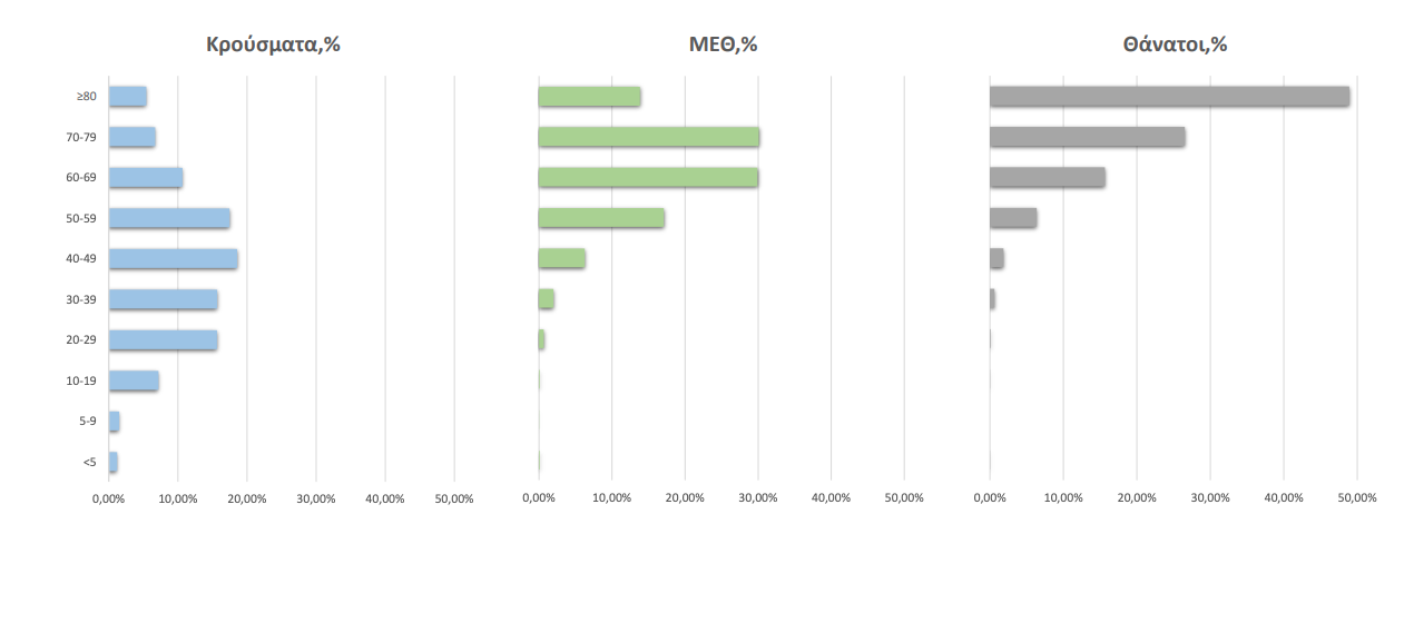 Ο αριθμός των ασθενών που νοσηλεύονται διασωληνωμένοι είναι 847 (62.1% άνδρες). Η διάμεση ηλικία τους είναι 68 έτη. To 85.6% έχει υποκείμενο νόσημα ή/και ηλικία 70 ετών και άνω. Από την αρχή της πανδημίας έχουν εξέλθει από τις ΜΕΘ 1.943 ασθενείς. Οι εισαγωγές2 νέων ασθενών Covid-19 στα νοσοκομεία της επικράτειας είναι 468 (ημερήσια μεταβολή -5.45%). Ο μέσος όρος εισαγωγών του επταημέρου είναι 509 ασθενείς.Η διάμεση ηλικία των κρουσμάτων είναι 44 έτη (εύρος 0.2 έως 106 έτη), ενώ η διάμεση ηλικία των θανόντων είναι 79 έτη (εύρος 0.2 έως 106 έτη). Διάγραμμα 4: Ηλικιακή Κατανομή κρουσμάτων, νοσηλευόμενων στις MEΘ και ασθενών που απεβίωσαν από την αρχή της πανδημίας