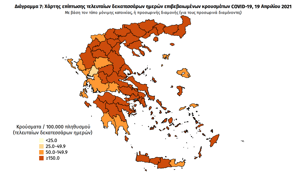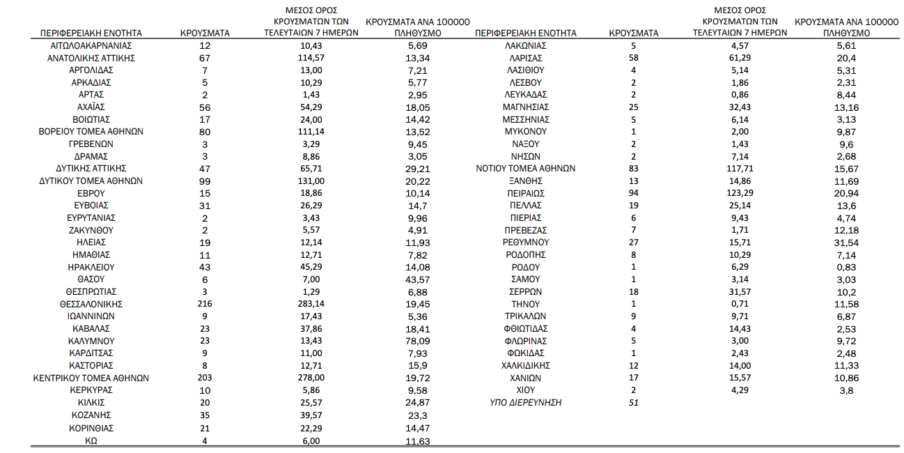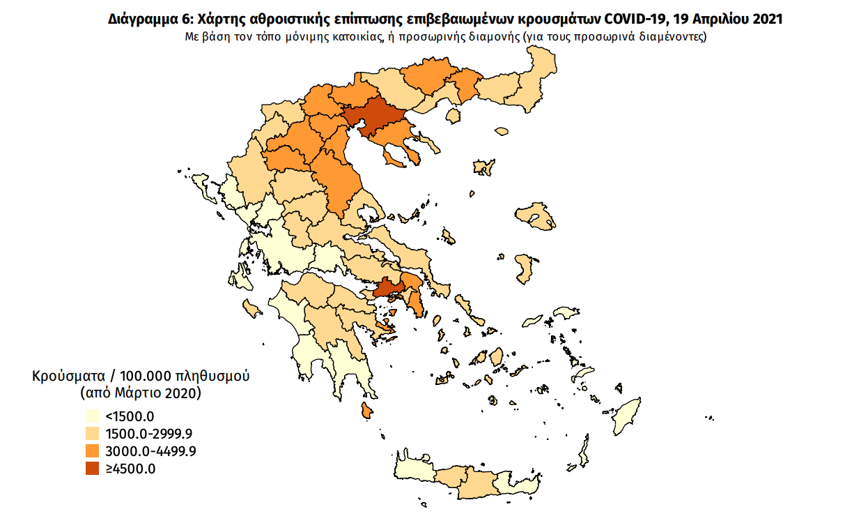 Γεωγραφική διασπορά: Ο χάρτης αποτυπώνει τη γεωγραφική κατανομή των συνολικών κρουσμάτων COVID-19 (από την αρχή της επιδημίας) ανά Περιφερειακή Ενότητα της χώρας, με βάση την δηλωθείσα διεύθυνση μόνιμης κατοικίας του ασθενούς, ή τη διεύθυνση προσωρινής διαμονής για τους τουρίστες και άλλους προσωρινά διαμένοντες στην Ελλάδα. Συμπεριλαμβάνονται τόσο κρούσματα με ιστορικό ταξιδίου (“εισαγόμενα”) όσο και κρούσματα με πιθανή εγχώρια μετάδοση