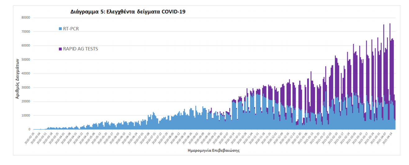 Δείγματα που έχουν ελεγχθεί: Από την 1η Ιανουαρίου 2020 μέχρι σήμερα, στα εργαστήρια που διενεργούν ελέγχους για τον νέο κορωνοϊό (SARS-CoV-2) και που δηλώνουν συστηματικά το σύνολο των δειγμάτων που ελέγχουν, έχουν συνολικά ελεγχθεί 4.472.000 κλινικά δείγματα ενώ από Μονάδες Υγείας και Κλιμάκια του ΕΟΔΥ που διενεργούν ελέγχους Rapid Ag έχουν ελεγχθεί 3.017.656 δείγματα. O μέσος όρος του επταημέρου είναι 54.312 δειγματοληπτικοί έλεγχοι ημερησίως. Mαζικές Δειγματοληψίες ΕΟΔΥ: Στις 18 Απριλίου 2021, πραγματοποιήθηκαν 37 δράσεις δειγματοληπτικών ελέγχων από τις Κινητές Ομάδες Υγείας (ΚΟΜΥ) του ΕΟΔΥ, στις οποίες διενεργήθηκαν 6.050 έλεγχοι Rapid Ag και ανευρέθηκαν 131 θετικά (2.17%)