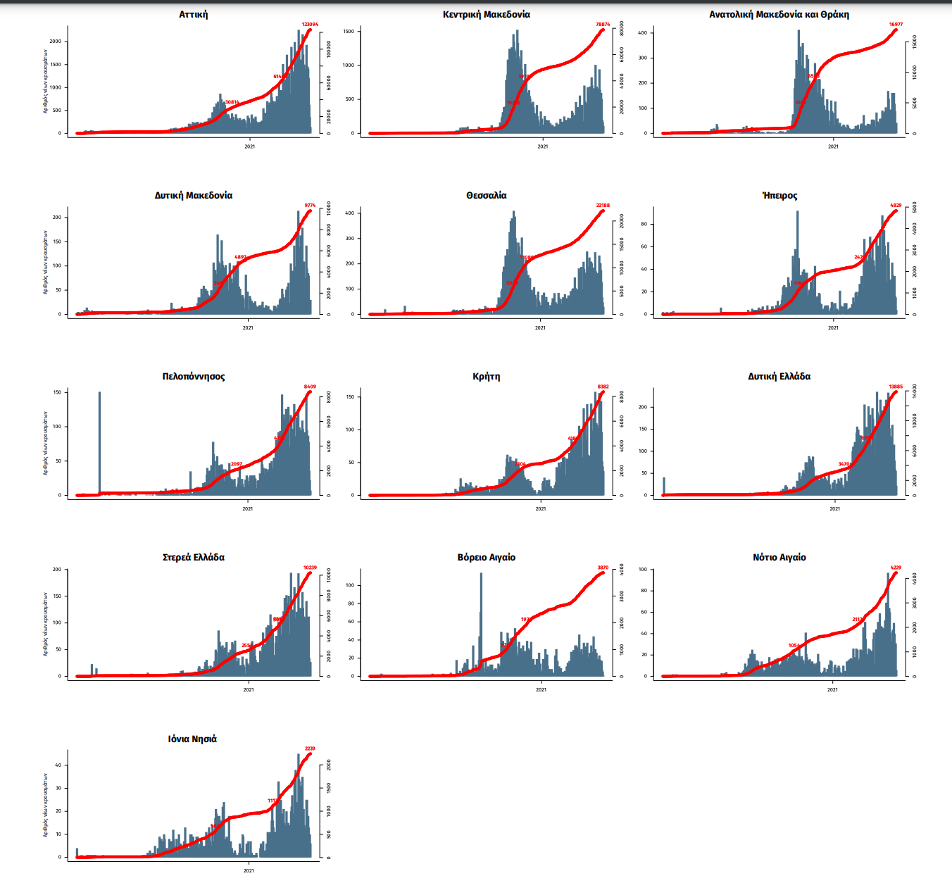 Παράρτημα 1: Επιδημικές καμπύλες κρουσμάτων COVID-19 με βάση την δηλωθείσα διεύθυνση μόνιμης κατοικίας του κρούσματος ή τη διεύθυνση προσωρινής διαμονής για τους τουρίστες και άλλους προσωρινά διαμένοντες στην Ελλάδα. Συμπεριλαμβάνονται τόσο κρούσματα με ιστορικό ταξιδίου όσο και κρούσματα με πιθανή εγχώρια μετάδοση