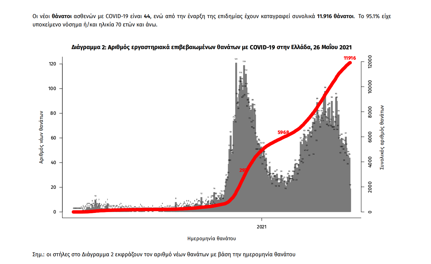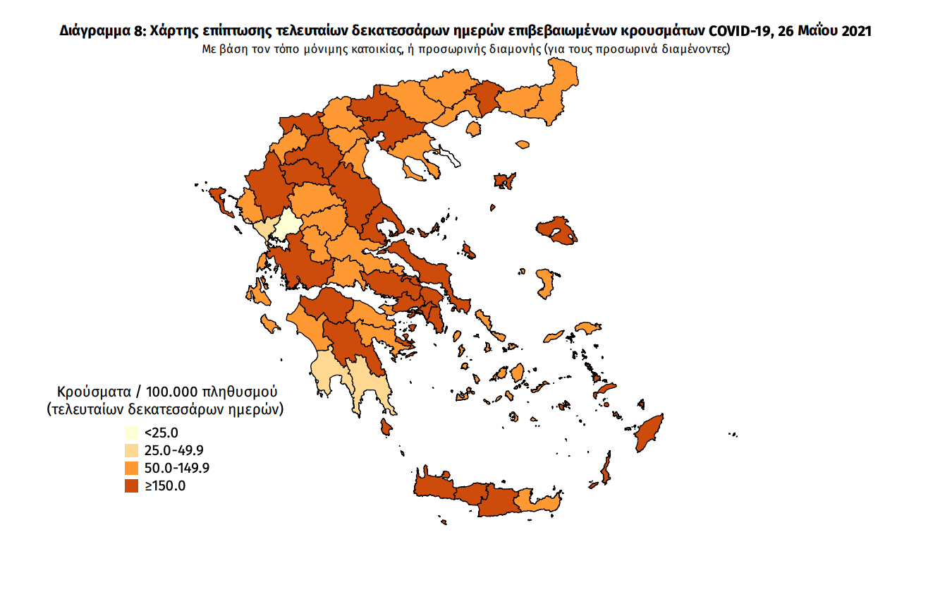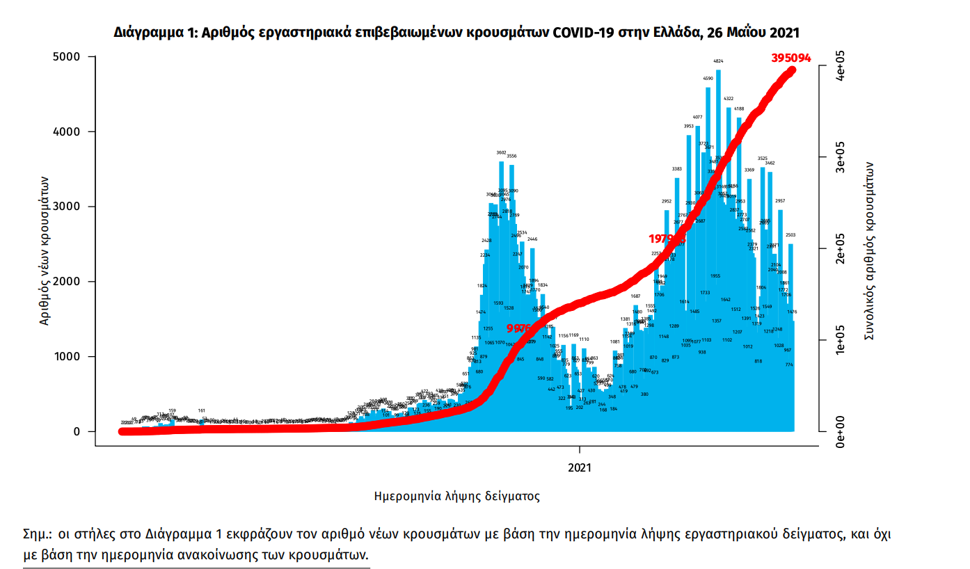 Τα στοιχεία που παρουσιάζονται αφορούν περιστατικά από την επιδημιολογική επιτήρηση της νόσου από το νέο κορωνοϊό (COVID19), με βάση τα δεδομένα που έχουν δηλωθεί στον ΕΟΔΥ και καταγραφεί μέχρι τις 26 Μαΐου 2021 (ώρα 15:00). Τα νέα εργαστηριακά επιβεβαιωμένα κρούσματα της νόσου που καταγράφηκαν τις τελευταίες 24 ώρες είναι 1.517, εκ των οποίων κανένα δεν εντοπίστηκε σε ελέγχους στις πύλες εισόδου της χώρας.