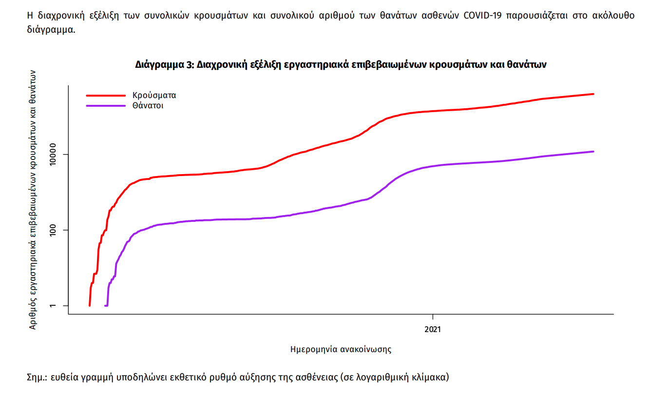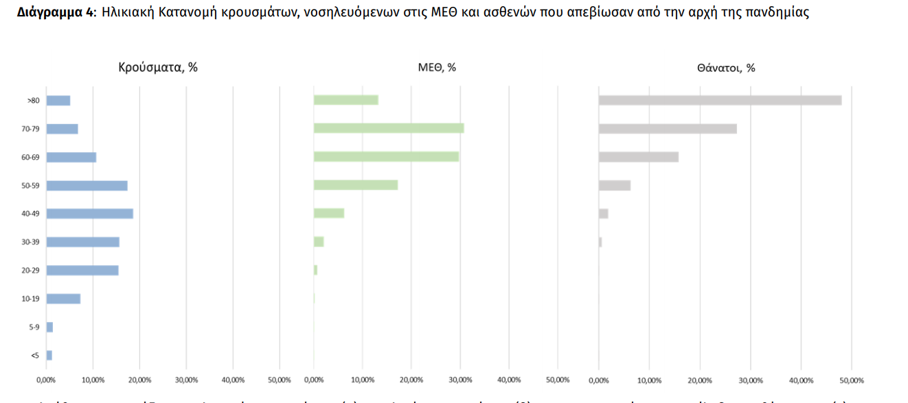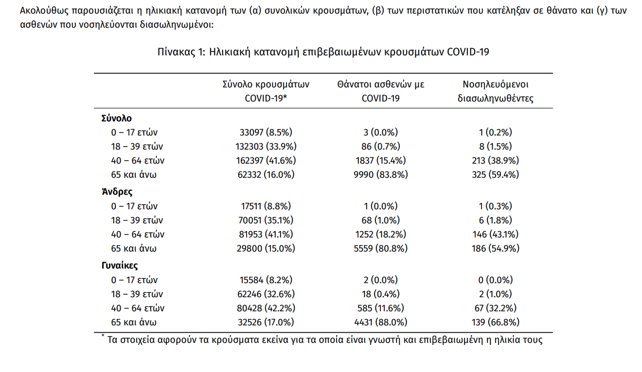 Ο αριθμός των ασθενών που νοσηλεύονται διασωληνωμένοι είναι 547 (62.3% άνδρες). Η διάμεση ηλικία τους είναι 67 έτη. To 84.6% έχει υποκείμενο νόσημα ή/και ηλικία 70 ετών και άνω. Από την αρχή της πανδημίας έχουν εξέλθει από τις ΜΕΘ 2.391 ασθενείς. Οι εισαγωγές2 νέων ασθενών Covid-19 στα νοσοκομεία της επικράτειας είναι 250 (ημερήσια μεταβολή +28.87%). Ο μέσος όρος εισαγωγών του επταημέρου είναι 244 ασθενείς.Η διάμεση ηλικία των κρουσμάτων είναι 44 έτη (εύρος 0.2 έως 106 έτη), ενώ η διάμεση ηλικία των θανόντων είναι 78 έτη (εύρος 0.2 έως 106 έτη).