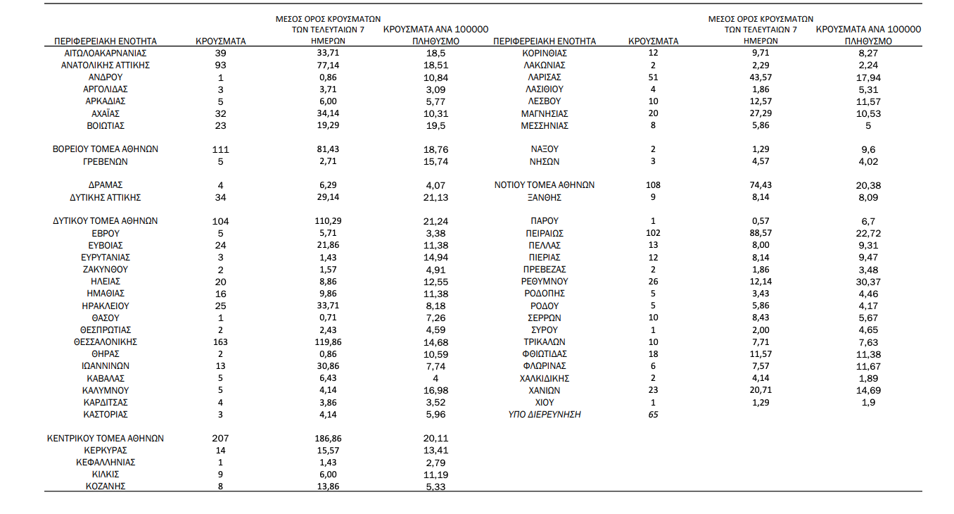 Κατανομή ανακοινωθέντων εγχώριων κρουσμάτων: Από το σύνολο των 1.517 νέων κρουσμάτων του νέου ιού στη χώρα 0 είναι εισαγόμενα εκ των οποίων 0 εντοπίστηκε κατόπιν ελέγχων στις πύλες εισόδου της χώρας. Η κατανομή των 1.517 νέων εγχώριων κρουσμάτων ανά Περιφερειακή Ενότητα παρουσιάζεται στον κατωτέρω πίνακα.3 Πίνακας 2: Ημερήσιος αριθμός και κρούσματα ανά 100.000 πληθυσμού επιβεβαιωμένων εγχώριων κρουσμάτων COVID-19 ανά περιφερειακή ενότητα στις 26 Μαΐου 2021
