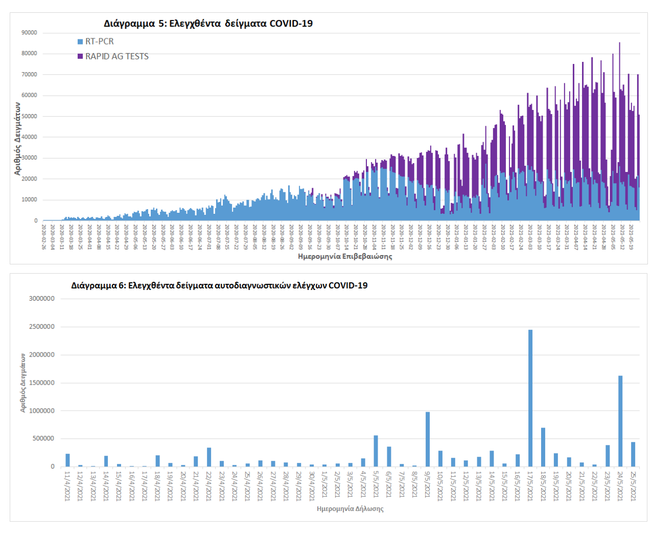Δείγματα που έχουν ελεγχθεί: Από την 1η Ιανουαρίου 2020 μέχρι σήμερα, στα εργαστήρια που διενεργούν ελέγχους για τον νέο κορωνοϊό (SARS-CoV-2) και που δηλώνουν συστηματικά το σύνολο των δειγμάτων που ελέγχουν, έχουν συνολικά ελεγχθεί 5.014.790 κλινικά δείγματα ενώ από Μονάδες Υγείας και Κλιμάκια του ΕΟΔΥ που διενεργούν ελέγχους Rapid Ag έχουν ελεγχθεί 4.315.121 δείγματα. O μέσος όρος του επταημέρου είναι 46.672 δειγματοληπτικοί έλεγχοι. Mαζικές Δειγματοληψίες ΕΟΔΥ: Στις 25 Μαΐου 2021, πραγματοποιήθηκαν 137 δράσεις δειγματοληπτικών ελέγχων από τις Κινητές Ομάδες Υγείας (ΚΟΜΥ) του ΕΟΔΥ, στις οποίες διενεργήθηκαν 14.338 έλεγχοι Rapid Ag και ανευρέθηκαν 239 θετικά (1,67%). Αυτοδιαγνωστικοί έλεγχοι (Self-tests): Έως 25 Μαΐου 2021, έχουν καταγραφεί ηλεκτρονικά 11.691.177 δηλώσεις αποτελέσματος αυτοδιαγνωστικού ελέγχου. Από τα 222.122 άτομα που προσήλθαν για επανέλεγχο έως και τις 25 Μαΐου 2021, έχουν καταγραφεί 23.433 θετικά αποτελέσματα
