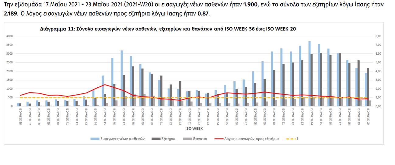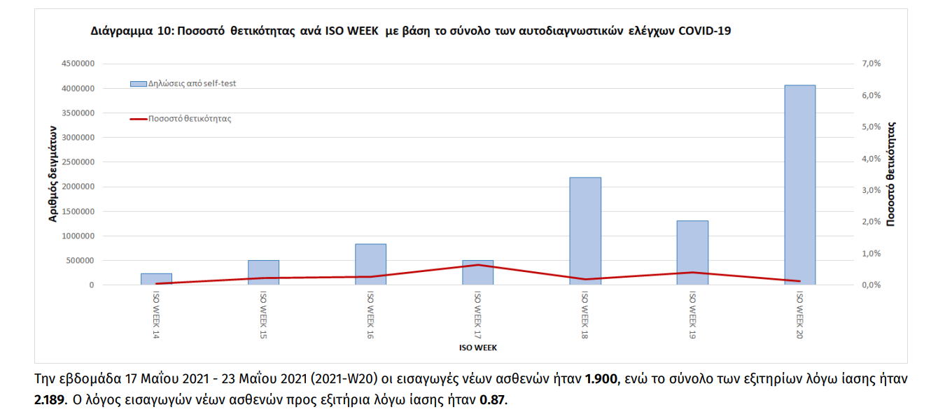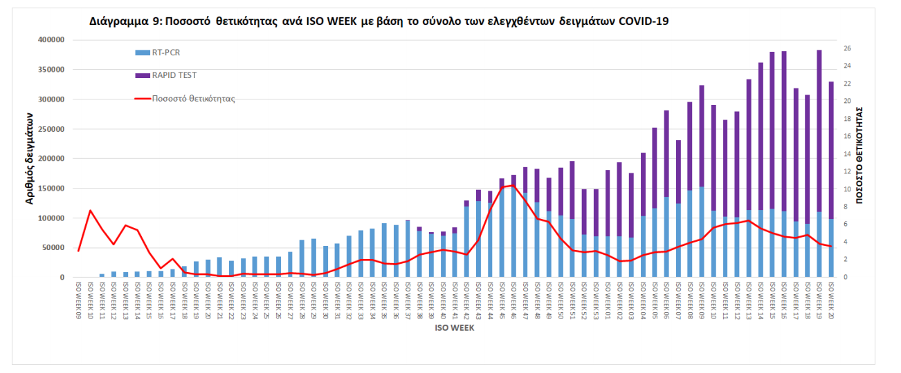 Συγκεντρωτικά στοιχεία της εβδομάδας 17 Μαΐου 2021 – 23 Μαΐου 2021 (2021-W20) Την εβδομάδα 17 Μαΐου 2021 – 23 Μαΐου 2021 (2021-W20) το ποσοστό θετικότητας ήταν 3.66% σε σύνολο 98.291 RT-PCR και 231.018 Rapid Ag δείγματα, ενώ ήταν 0.13% σε σύνολο 4.059.188 αυτοδιαγνωστικών ελέγχων. Στο σύνολο των δειγματοληπτικών ελέγχων, το ποσοστό θετικότητας ήταν 0.29%
