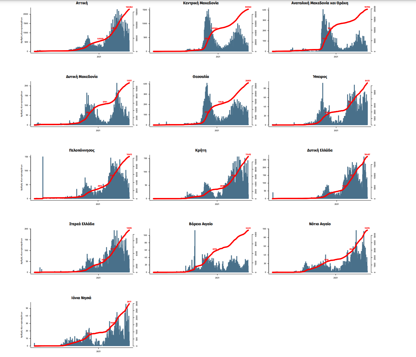 Παράρτημα 1: Επιδημικές καμπύλες κρουσμάτων COVID-19 με βάση την δηλωθείσα διεύθυνση μόνιμης κατοικίας του κρούσματος ή τη διεύθυνση προσωρινής διαμονής για τους τουρίστες και άλλους προσωρινά διαμένοντες στην Ελλάδα. Συμπεριλαμβάνονται τόσο κρούσματα με ιστορικό ταξιδίου όσο και κρούσματα με πιθανή εγχώρια μετάδοση.
