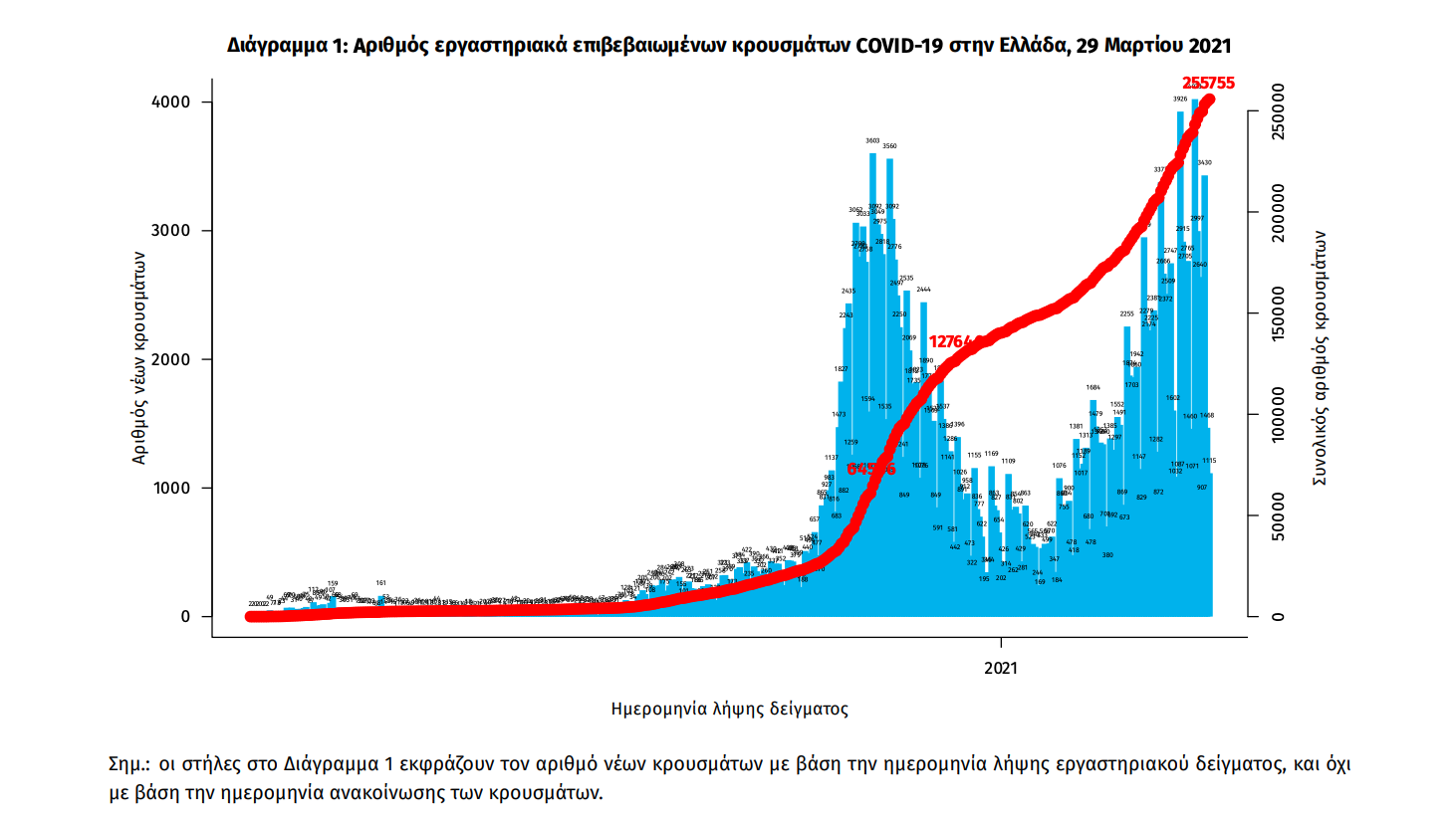 Τα στοιχεία που παρουσιάζονται αφορούν περιστατικά από την επιδημιολογική επιτήρηση της νόσου από το νέο κορωνοϊό (COVID19), με βάση τα δεδομένα που έχουν δηλωθεί στον ΕΟΔΥ και καταγραφεί μέχρι τις 29 Μαρτίου 2021 (ώρα 15:00). Τα νέα εργαστηριακά επιβεβαιωμένα κρούσματα της νόσου που καταγράφηκαν τις τελευταίες 24 ώρες είναι 1.724, εκ των οποίων 22 εντοπίστηκαν κατόπιν ελέγχων στις πύλες εισόδου της χώρας. Ο συνολικός αριθμός των κρουσμάτων ανέρχεται σε 255.755 (ημερήσια μεταβολή +0.7%), εκ των οποίων 51.5% άνδρες. Με βάση τα επιβεβαιωμένα κρούσματα των τελευταίων 7 ημερών, 72 θεωρούνται σχετιζόμενα με ταξίδι από το εξωτερικό και 2.162 είναι σχετιζόμενα με ήδη γνωστό κρούσμα. Ημερήσια εξέλιξη της πανδημίας: Η ημερήσια κατανομή των επιβεβαιωμένων κρουσμάτων είναι η ακόλουθη (η γραμμή παριστάνει την συνολική, αθροιστική κατανομή των κρουσμάτων).