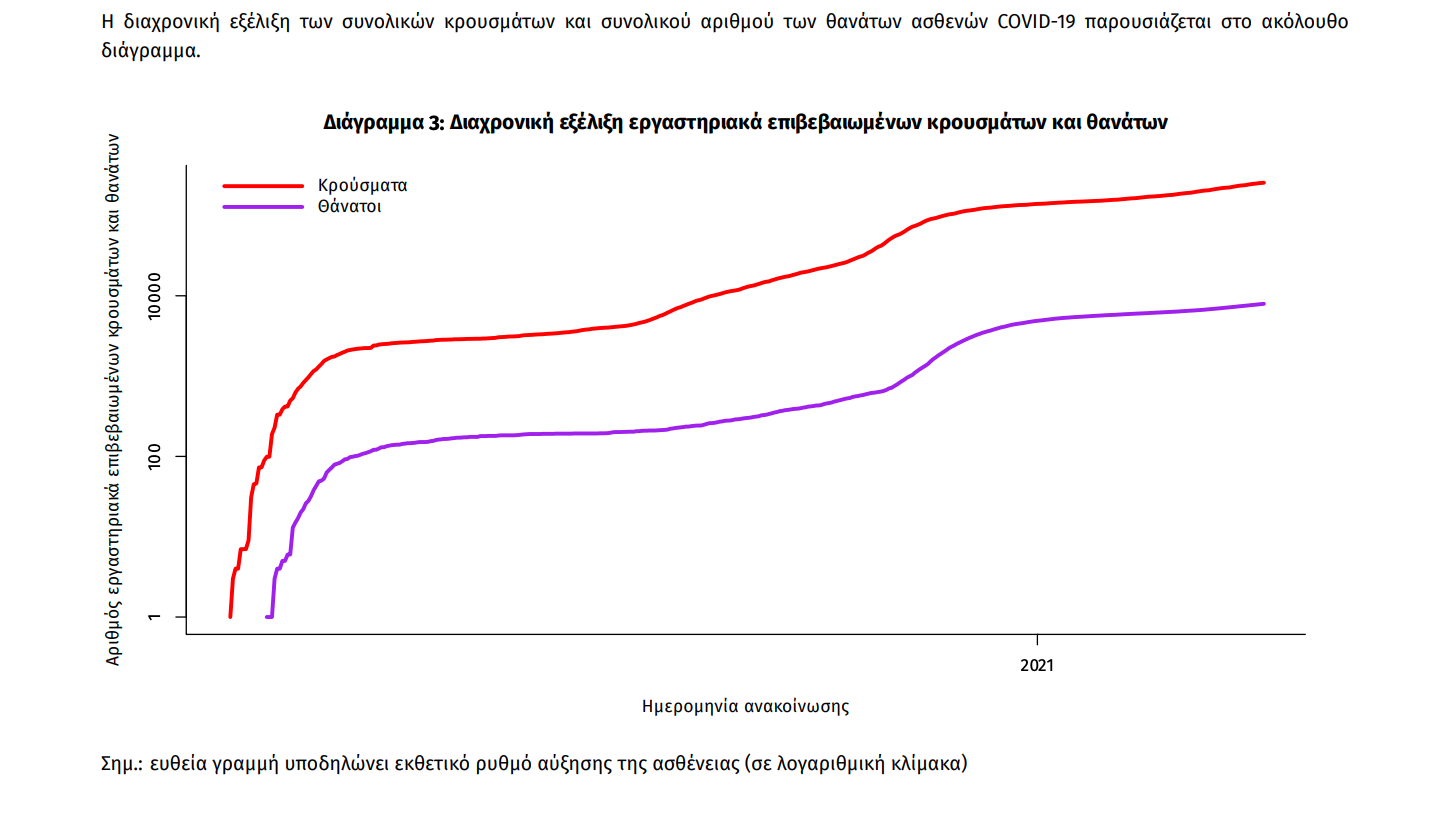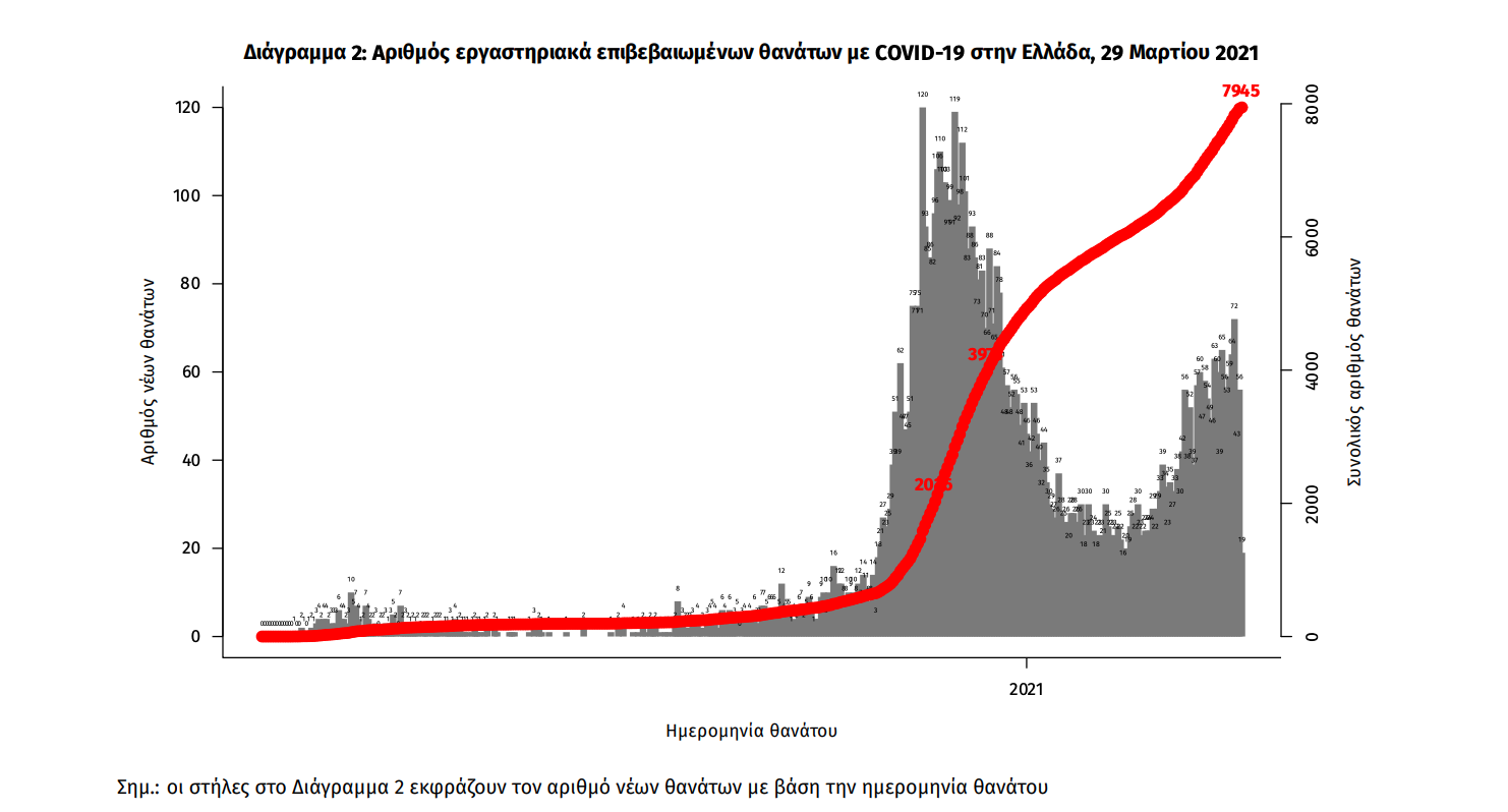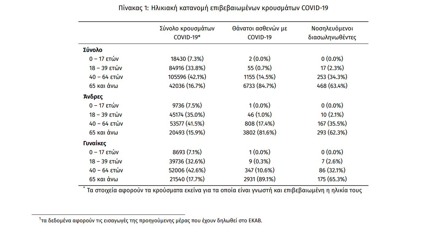 Οι νέοι θάνατοι ασθενών με COVID-19 είναι 65, ενώ από την έναρξη της επιδημίας έχουν καταγραφεί συνολικά 7.945 θάνατοι. Το 95.7% είχε υποκείμενο νόσημα ή/και ηλικία 70 ετών και άνω.